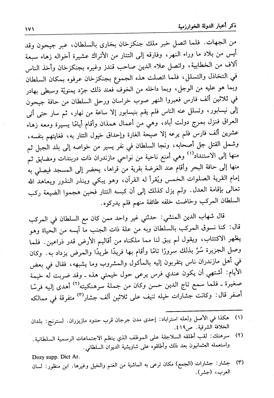 من الجهات . فلما اتصل خبر ملك جنكزخان بخارى بالسلطان ، عبر جيحون وقد أيس من بلاد ما وراء النهر ، وفارقه إلى التتار من الأتراك عشيرة أخواله زهاء سبعة آلاف من الخطايية ، واتصل علاء الدين صاحب قندز وغيره بجنكزخان وأخذ الناس في التخاذل والتسلل ، فلما اتصلت هذه الجموع بجنكزخان عرفوه بمكان السلطان وبما هو عليه من الوجل ، وبما داخله من الخوف فعند ذلك جرد يمنوية وسبطى بهادر في ثلاثين ألف فارس فعبروا النهر صوب خراسان ورحل السلطان من حافة جيحون إلى نيسابور ، وتسلل عنه الناس فلم يقم بنيسابور إلا ساعة من نهار ، ثم سار حتى أتى العراق فنزل بمرج دولت أباد ، وهي من أعمال همذان وأقام أياما يسيرة ومعه زهاء عشرين ألف فارس فلم يرعه إلا صيحة الغارة وإحداق خيول التتار به ، فغاتهم بنفسه ، وشمل القتل جل أصحابه ، ونجا السلطان في نفر يسير من خواصه إلى بلد الجبل ثم منها إلى الاستنداد وهي أمنع ناحية من نواحي مازندران ذات دربندات ومضايق ثم منها إلى حافة البحر وأقام عند الغرضة بقرية من قراها ، يحضر إلى المسجد فيصلى به إمام القرية الصلوات الخمس ويقرأ له القرآن ، وهو يبكي وينذر النذور ويعاهد الله تعالى بإقامة العدل . ولم يزل كذلك إلى أن كبسه التتار فحين هجموا الضيعة ركب السلطان المركب وخاضت خلفه طائفة منهم فلم يدركوه .