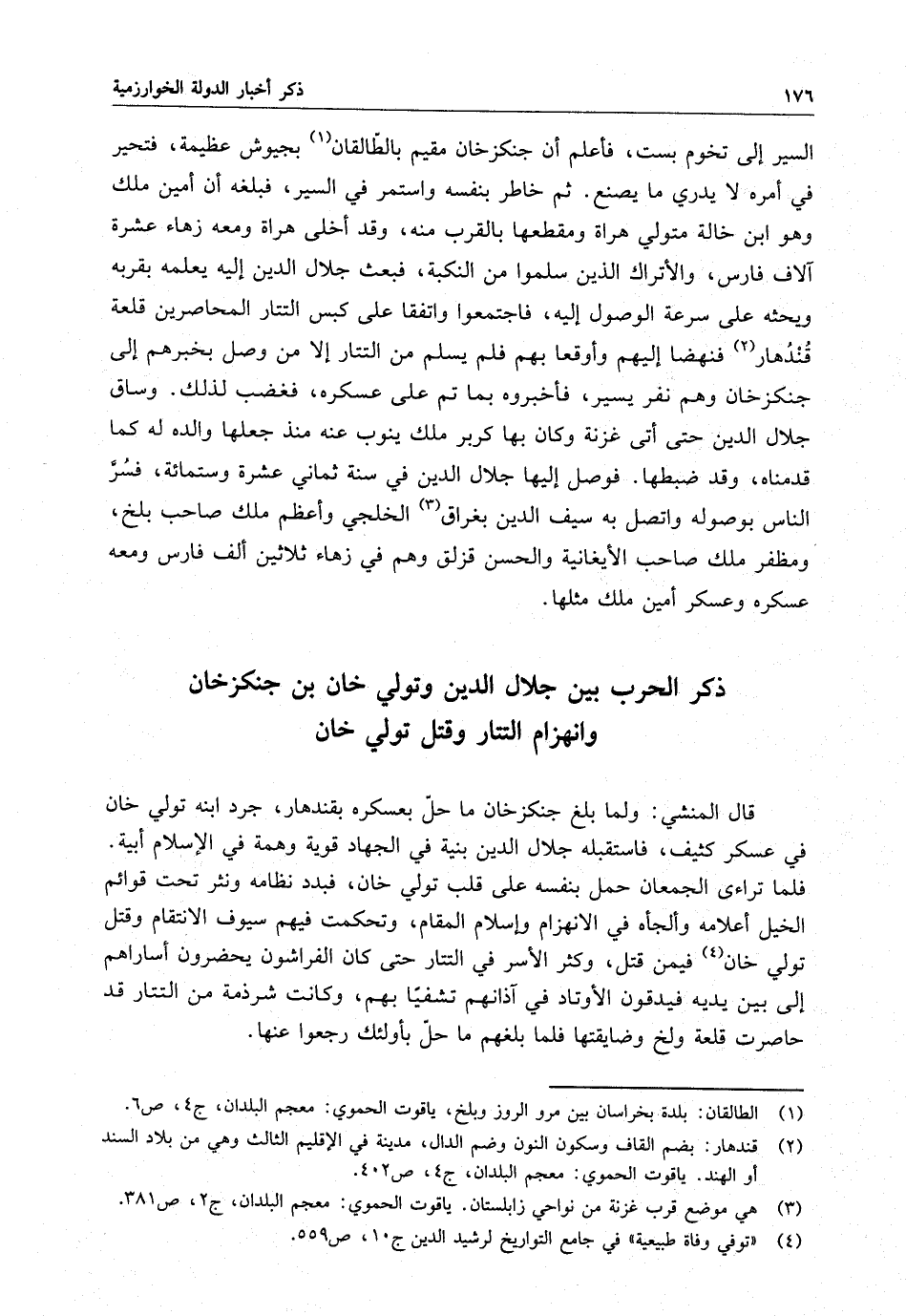 السير إلى تخوم بست ، فأعلم أن جنكزخان مقيم بالطالقان بجيوش عظيمة ، فتحير في أمره لا يدري ما يصنع . ثم خاطر بنفسه واستمر في السير ، فبلغه أن أمين ملك وهو ابن خالة متولى هراة ومقطعها بالقرب منه ، وقد أخلى هراة ومعه زهاء عشرة آلاف فارس ، والأتراك الذين سلموا من النكبة ، فبعث جلال الدين إليه يعلمه بقربه ويحثه على سرعة الوصول إليه ، فاجتمعوا واتفقا على كبس التتار المحاصرين قلعة قند هار فنهضا إليهم وأوقعا بهم فلم يسلم من التتار إلا من وصل بخبرهم إلى جنكزخان وهم نفر يسير ، فأخبروه بما تم على عسكره ، فغضب لذلك . وساق جلال الدين حتى أتى غزنة وكان بها كربر ملك ينوب عنه منذ جعلها والده له كما قدمناه ، وقد ضبطها . فوصل إليها جلال الدين في سنة ثماني عشرة وستماية ، فسر الناس بوصوله واتصل به سيف الدين بغراق الخلجي وأعظم ملك صاحب بلخ ، ومظفر ملك صاحب الأيغانية والحسن قزلق وهم في زهاء ثلاثين ألف فارس ومعه عسكره وعسكر أمين ملك مثلها .