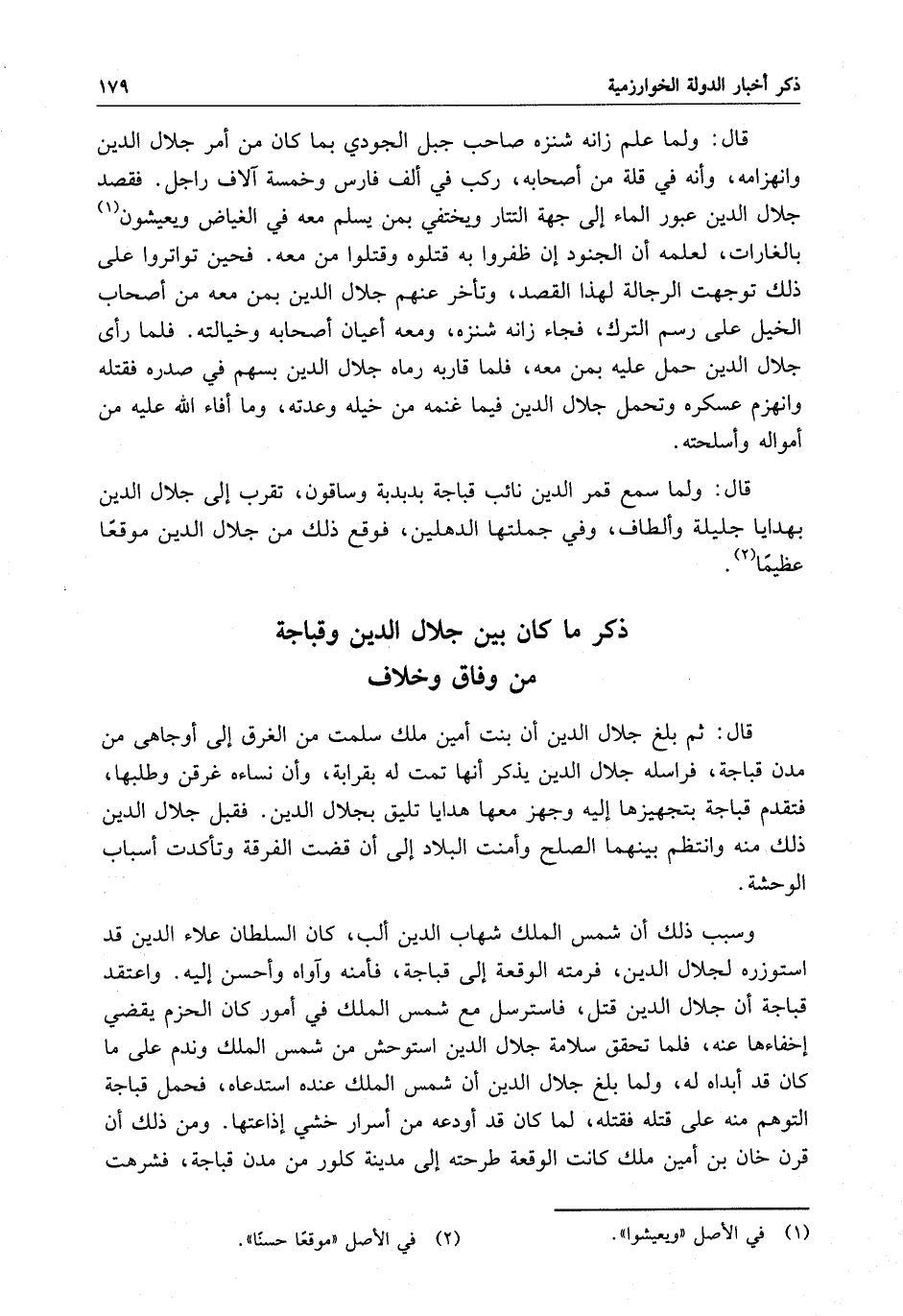 قال : ثم بلغ جلال الدين أن بنت أمين ملك سلمت من الغرق إلى أوجاهى من مدن قباجة ، فراسله جلال الدين يذكر أنها تمت له بقرابة ، وأن نساءه غرقن وطلبها ، فتقدم قباجة بتجهيزها إليه وجهز معها هدايا تليق بجلال الدين . فقبل جلال الدين ذلك منه وانتظم بينهما الصلح وأمنت البلاد إلى أن قضت الفرقة وتأكدت أسباب الوحشة وسبب ذلك أن شمس الملك شهاب الدين ألب ، كان السلطان علاء الدين قد استوزره لجلال الدين ، فرمته الوقعة إلى قباجة ، فأمنه وآواه وأحسن إليه . واعتقد قباجة أن جلال الدين قتل ، فاسترسل مع شمس الملك في أمور كان الحزم يقضي إخفاءها عنه ، فلما تحقق سلامة جلال الدين استوحش من شمس الملك وندم على ما كان قد أبداه له ، ولما بلغ جلال الدين أن شمس الملك عنده استدعاه ، فحمل قباجة التوهم منه على قتله فقتله ، لما كان قد أودعه من أسرار خشى إذاعتها . ومن ذلك أن قرن خان بن أمين ملك كانت الوقعة طرحته إلى مدينة كلور من مدن قباجة ، فشرهت