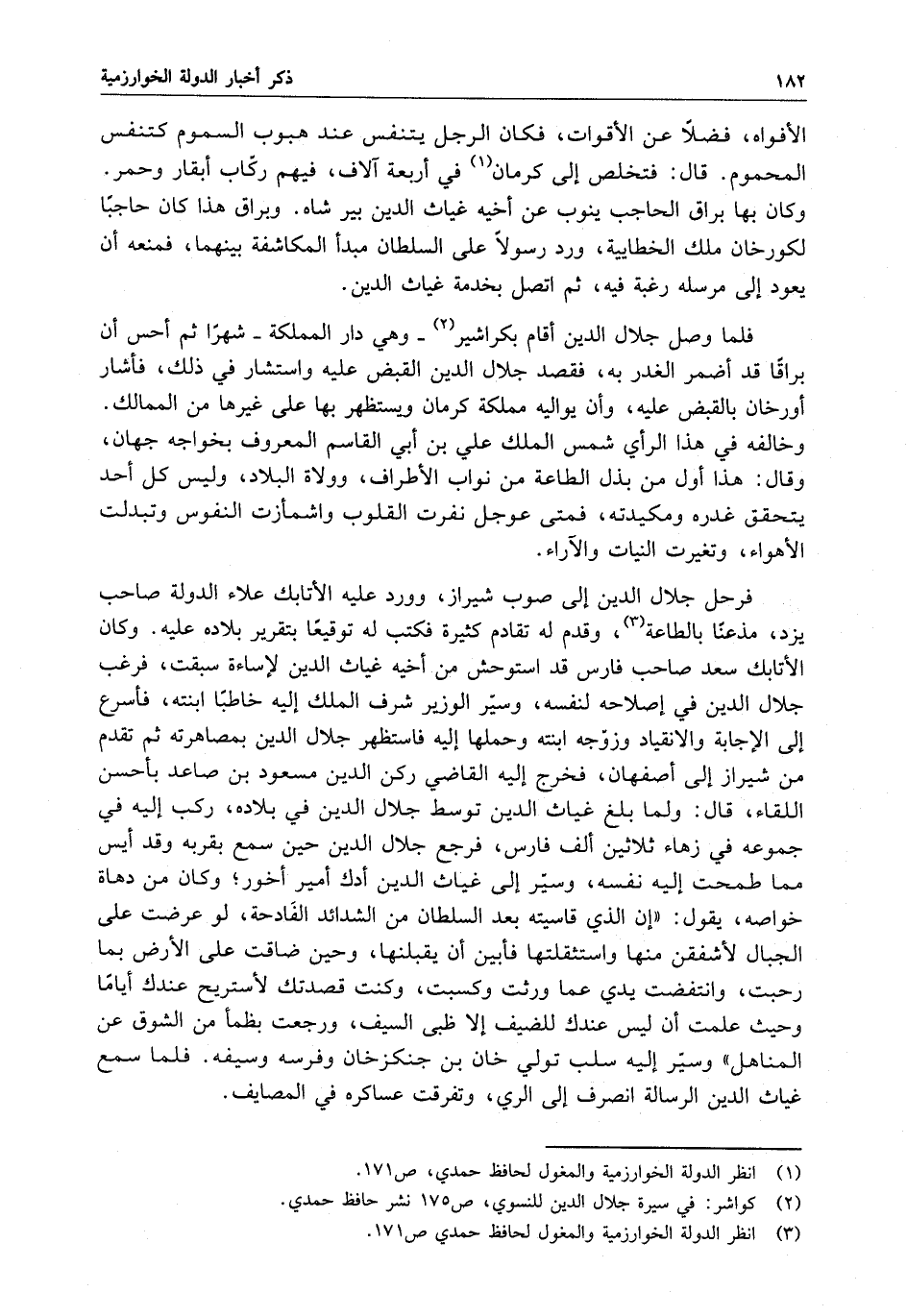 فلما وصل جلال الدين أقام بكراشير - وهي دار المملكة - شهرا ثم أحس أن براقا قد أضمر الغدر به ، فقصد جلال الدين القبض عليه واستشار في ذلك ، فأشار أورخان بالقبض عليه ، وأن يواليه مملكة كرمان ويستظهر بها على غيرها من الممالك . وخالفه في هذا الرأي شمس الملك علي بن أبي القاسم المعروف بخواجه جهان ، وقال : هذا أول من بذل الطاعة من نواب الأطراف ، وولاة البلاد ، وليس كل أحد يتحقق غدره ومكيدته ، فمتى عوجل نفرت القلوب واشمأزت النفوس وتبدلت الأهواء ، وتغيرت النيات والآراء .