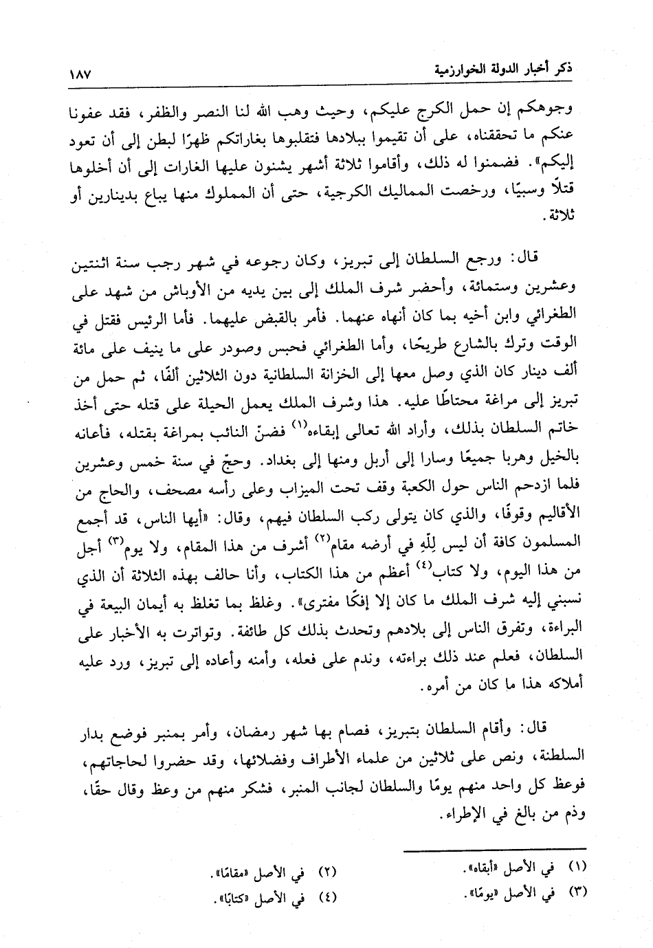 وجوهكم إن حمل الكرج عليكم ، وحيث وهب الله لنا النصر والظفر ، فقد عفونا عنكم ما تحققناه ، على أن تقيموا ببلادها فتقلبوها بغاراتكم ظهراً لبطن إلى أن تعود إليكم . فضمنوا له ذلك ، وأقاموا ثلاثة أشهر يشنون عليها الغارات إلى أن أخلوها قتلا وسبيا ، ورخصت المماليك الكرجية ، حتى أن المملوك منها يباع بدينارين أو ثلاثة . قال : ورجع السلطان إلى تبريز ، وكان رجوعه في شهر رجب سنة اثنتين وعشرين وستماية ، وأحضر شرف الملك إلى بين يديه من الأوباش من شهد على الطغرائي وابن أخيه بما كان أنهاه عنهما . فأمر بالقبض عليهما . فأما الرئيس فقتل في الوقت وترك بالشارع طريحا ، وأما الطغراني فحبس وصودر على ما ينيف على ماية ألف دينار كان الذي وصل منها إلى الخزانة السلطانية دون الثلاثين ألفا ، ثم حمل من تبريز إلى مراغة محتاطا عليه . هذا وشرف الملك يعمل الحيلة على قتله حتى أخذ خاتم السلطان بذلك ، وأراد الله تعالى إبقاءه فضن النائب بمراغة بقتله ، فأعانه بالخيل وهربا جميعا وسارا إلى أربل ومنها إلى بغداد . وحج في سنة خمس وعشرين فلما ازدحم الناس حول الكعبة وقف تحت الميزاب وعلى رأسه مصحف ، والحاج من الأقاليم وقوفا ، والذي كان يتولى ركب السلطان فيهم ، وقال : أيها الناس ، قد أجمع المسلمون كافة أن ليس لله في أرضه مقام أشرف من هذا المقام ، ولا يوم أجل من هذا اليوم ، ولا كتاب أعظم من هذا الكتاب ، وأنا حالف بهذه الثلاثة أن الذي نسبني إليه شرف الملك ما كان إلا إفكا مفترى . وغلظ بما تغلظ به إيمان البيعة في البراءة ، وتفرق الناس إلى بلادهم وتحدث بذلك كل طائفة . وتواترت به الأخبار على السلطان ، فعلم عند ذلك براءته ، وندم على فعله ، وأمنه وأعاده إلى تبريز ، ورد عليه أملاكه هذا ما كان من أمره .
