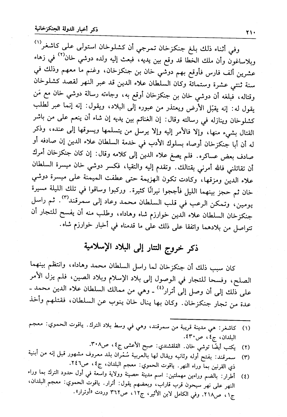 وفي أثناء ذلك بلغ جنكزخان تمرجي أن كشلوخان استولى على كاشغر وبلاساغون وأن ملك الخطا قد وقع بين يديه ، فبعث إليه ولده دوشي خان في زهاء عشرين ألف فارس فأوفع بهم دوشي خان ابن جنكزخان ، وغنم ما معهم وذلك في سنة ثنتي عشرة وستمائة وكان السلطان علاء الدين قد عبر النهر لقصد كشلوخان وقتاله ، فبلغه أن دوشي خان بن جنكزخان أوقع به ، وجاءته رسالة دوشي خان مع من يقول له : إنه يقبل الأرض ويعتذر من عبوره إلى البلاد ، ويقول : إنه إنما عبر لطلب كشلوخان وينازله في رسالته وقال : إن الغنائم بين يديه إن شاء أن ينعم على من باشر القتال بشيء منها ، وإلا فالأمر إليه وإلا يرسل من يتسلمها ويسوقها إلي عنده ، وذكر له أن أبا جنكزخان أوصاه بسلوك الأدب في خدمة السلطان علاء الدين إن صادفه أو صادف بعض عساكره . فلم يصغ علاء الدين إلى كلامه وقال : إن كان جنكزخان أمرك أن تقاتلني فالله أمرني بقتالك . وتقدم إليه والتقيا ، فكسر دوشي خان ميسرة السلطان علاء الدين ومزقها ، وكادت تكون الهزيمة حتى عطفت الميمنة على ميسرة دوشي خان ثم حجز بينهما الليل فأججوا نيرانا كثيرة . وركبوا وساقوا في تلك الليلة مسيرة يومين ، وتمكن الرعب في قلب السلطان محمد وعاد إلى سمرقند . ثم راسل جنكزخان السلطان علاء الدين خوارزم شاه وهاداه ، وطلب منه أن يفسح للتجار أن تتواصل من بلادهما واتفقا على ذلك على ما قدمناه في أخبار خوارزم شاه .