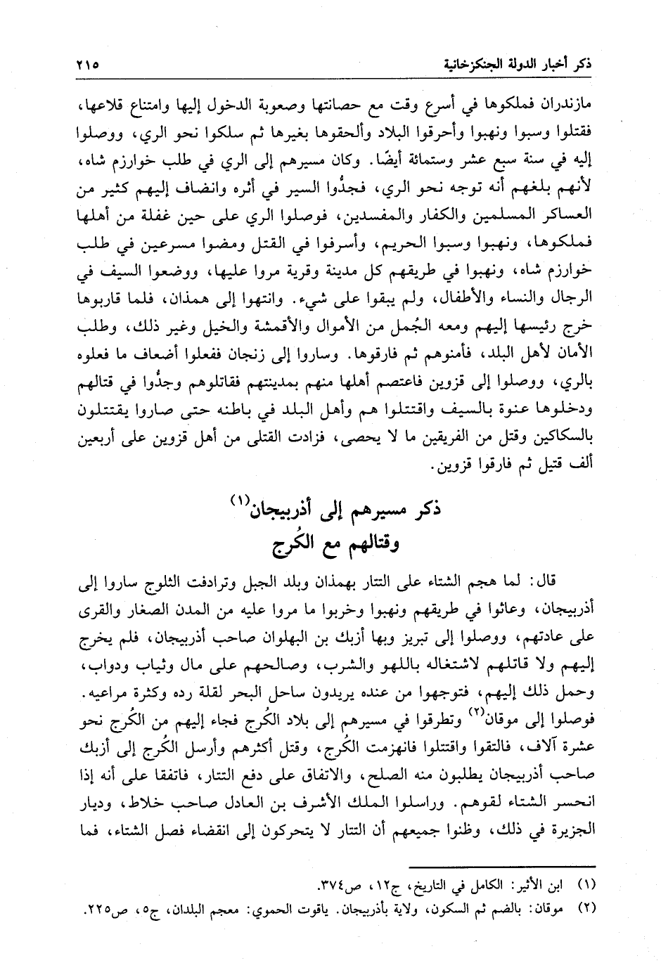 مازندران فملكوها في أسرع وقت مع حصانتها وصعوبة الدخول إليها وامتناع قلاعها ، فقتلوا وسبوا ونهبوا وأحرقوا البلاد وألحقوها بغيرها ثم سلكوا نحو الري ، ووصلوا إليه في سنة سبع عشرة وستماية أيضا . وكان مسيرهم إلى الري في طلب خوارزم شاه ، لأنهم بلغهم أنه توجه نحو الري ، فجدوا السير في أثره وانضاف إليهم كثير من العساكر المسلمين والكفارة والمفسدين ، فوصلوا الري على حين غفلة من أهلها فملكوها ، ونهبوا وسبوا الحريم ، وأسرفوا في القتل ومضوا مسرعين في طلب خوارزم شاه ، ونهبوا في طريقهم كل مدينة وقرية مروا عليها ، ووضعوا السيف في الرجال والنساء والأطفال ، ولم يبقوا على شيء . وانتهوا إلى همذان ، فلما قاربوها خرج رئيسها إليهم ومعه الجمل من الأموال والأقمشة والخيل وغير ذلك ، وطلب الأمان لأهل البلد ، فأمنوهم ثم فارقوها . وساروا إلى زنجان ففعلوا أضعاف ما فعلوه بالري ، ووصلوا إلى قزوين فاعتصم أهلها منهم بمدينتهم فقاتلوهم وجدوا في قتالهم ودخلوها عنوة بالسيف واقتتلوا هم وأهل البلد في باطنه حتى صاروا يقتتلون بالسكاكين وقتل من الفريقين ما لا يحصى ، فزادت القتلى من أهل قزوين على أربعين ألف قتيل ثم فارقوا قزوين .
