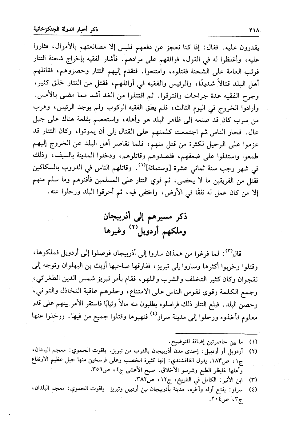قال : لما فرغوا من همدان ساروا إلى أذربيجان فوصلوا إلى أردويل فملكوها ، وقتلوا وخربوا أكثرها وساروا إلى تبريز ، ففارقها صاحبها أزبك بن البهلوان وتوجه إلى نقجوان وكان كثير التخلف والشرب واللهو ، فقام بأمر تبريز شمس الدين الطغرائي ، وجمع الكلمة وقوى نفوس الناس على الامتناع ، وحذرهم عاقبة التخاذل والتواني ، وحصن البلد . فبلغ التتار ذلك فراسلوه يطلبون منه مالا وثيابا فاستقر الأمر بينهم على قدر معلوم فأخذوه ورحلوا إلى مدينة سراو فنهبوها وقتلوا جميع من فيها . ورحلوا عنها