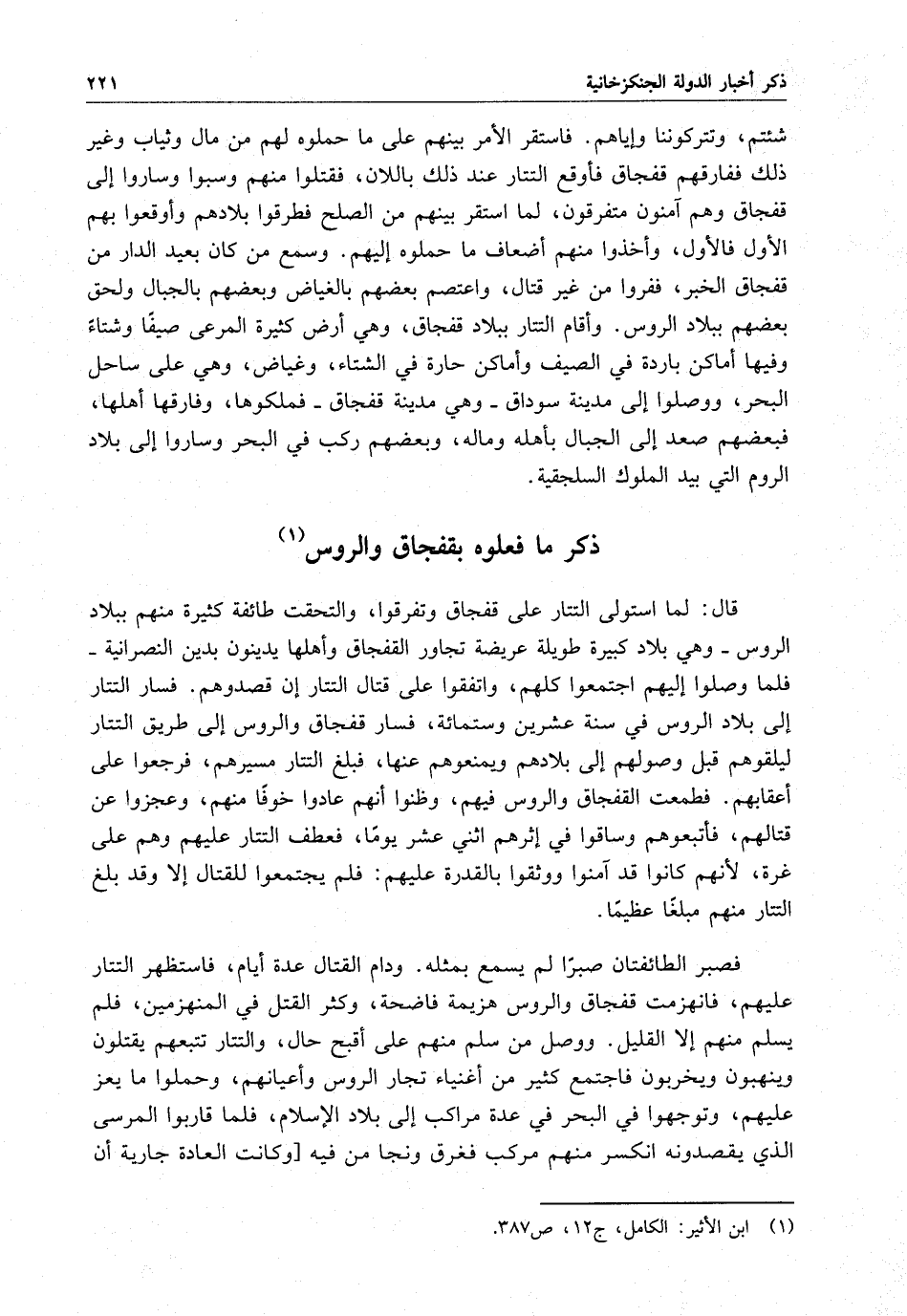 شئتم ، وتتركوننا وإياهم . فاستقر الأمر بينهم على ما حملوه لهم من مال وثياب وغير ذلك ففارقهم قفجاق فأوقع التتار عند ذلك باللان ، فقتلوا منهم وسبوا . وساروا إلى قفجاق وهم آمنون متفرقون ، لما استقر بينهم من الصلح فطرقوا بلادهم وأوقعوا بهم الأول فالأول ، وأخذوا منهم أضعاف ما حملوه إليهم . وسمع من كان بعيد الدار من قفجاق الخبر ، ففروا من غير قتال ، واعتصم بعضهم بالغياض وبعضهم بالجبال ولحق بعضهم ببلاد الروس . وأقام التتار ببلاد قفجاق ، وهي أرض كثيرة المرعى صيفا وشتاء وفيها أماكن باردة في الصيف وأماكن حارة في الشتاء ، وغياض ، وهي على ساحل البحر ، ووصلوا إلى مدينة سوداق - وهي مدينة قفجاق - فملكوها ، وفارقها أهلها ، فبعضهم صعد إلى الجبال بأهله وماله ، وبعضهم ركب في البحر وساروا إلى بلاد الروم التي بيد الملوك السلجقية . . .
