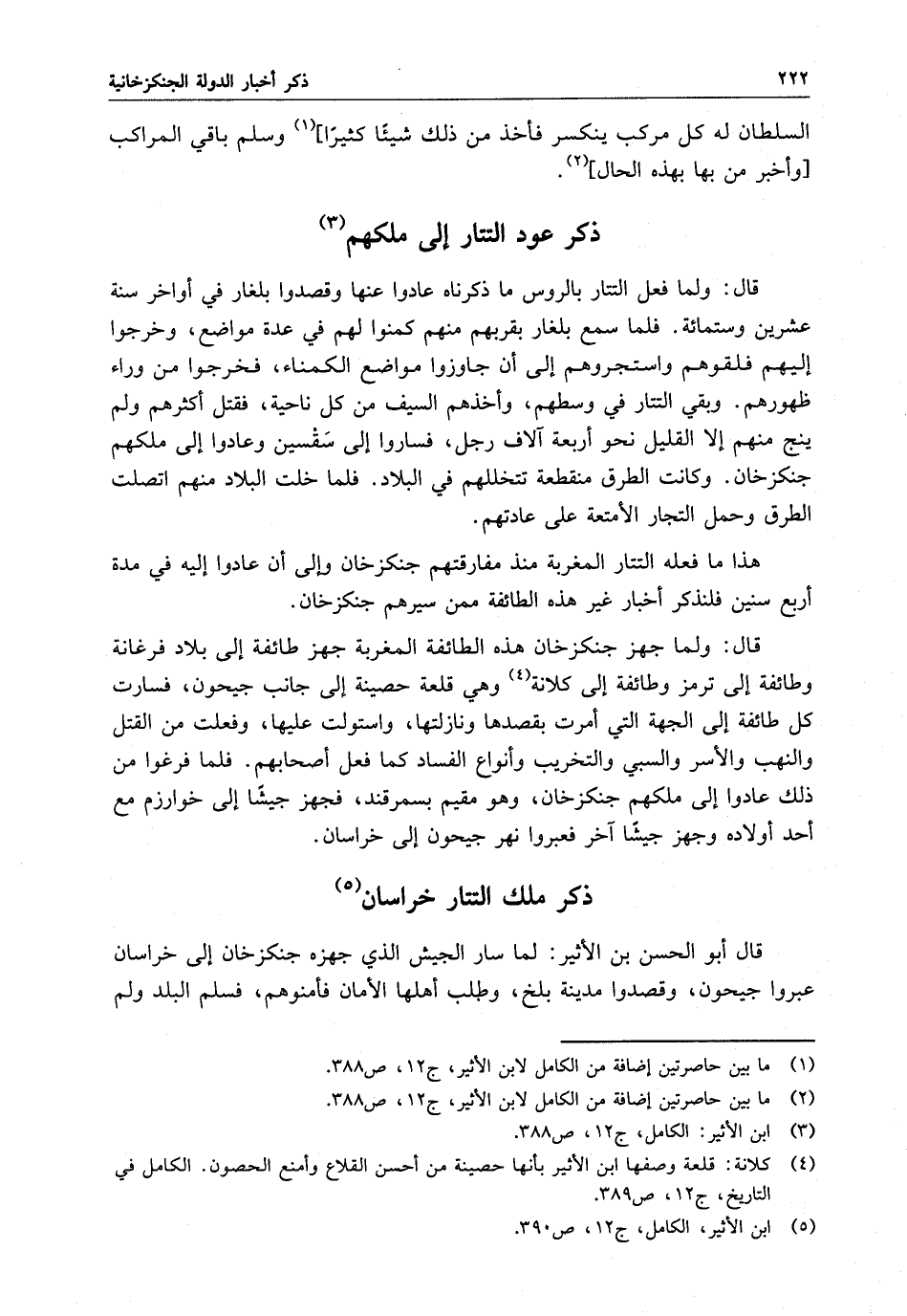 قال : ولما جهز جنكزخان هذه الطائفة المغربة جهز طائفة إلى بلاد فرغانة وطائفة إلى ترمز وطائفة إلى كلانة وهي قلعة حصينة إلى جانب جيحون ، فسارت كل طائفة إلى الجهة التي أمرت بقصدها ونازلتها ، واستولت عليها ، وفعلت من القتل والنهب والأسر والسبي والتخريب وأنواع الفساد كما فعل أصحابهم . فلما فرغوا من ذلك عادوا إلى ملكهم جنكزخان ، وهو مقيم بسمرقند ، فجهز جيشا إلى خوارزم مع أحد أولاده وجهز جيشا آخر فعبروا نهر جيحون إلى خراسان .