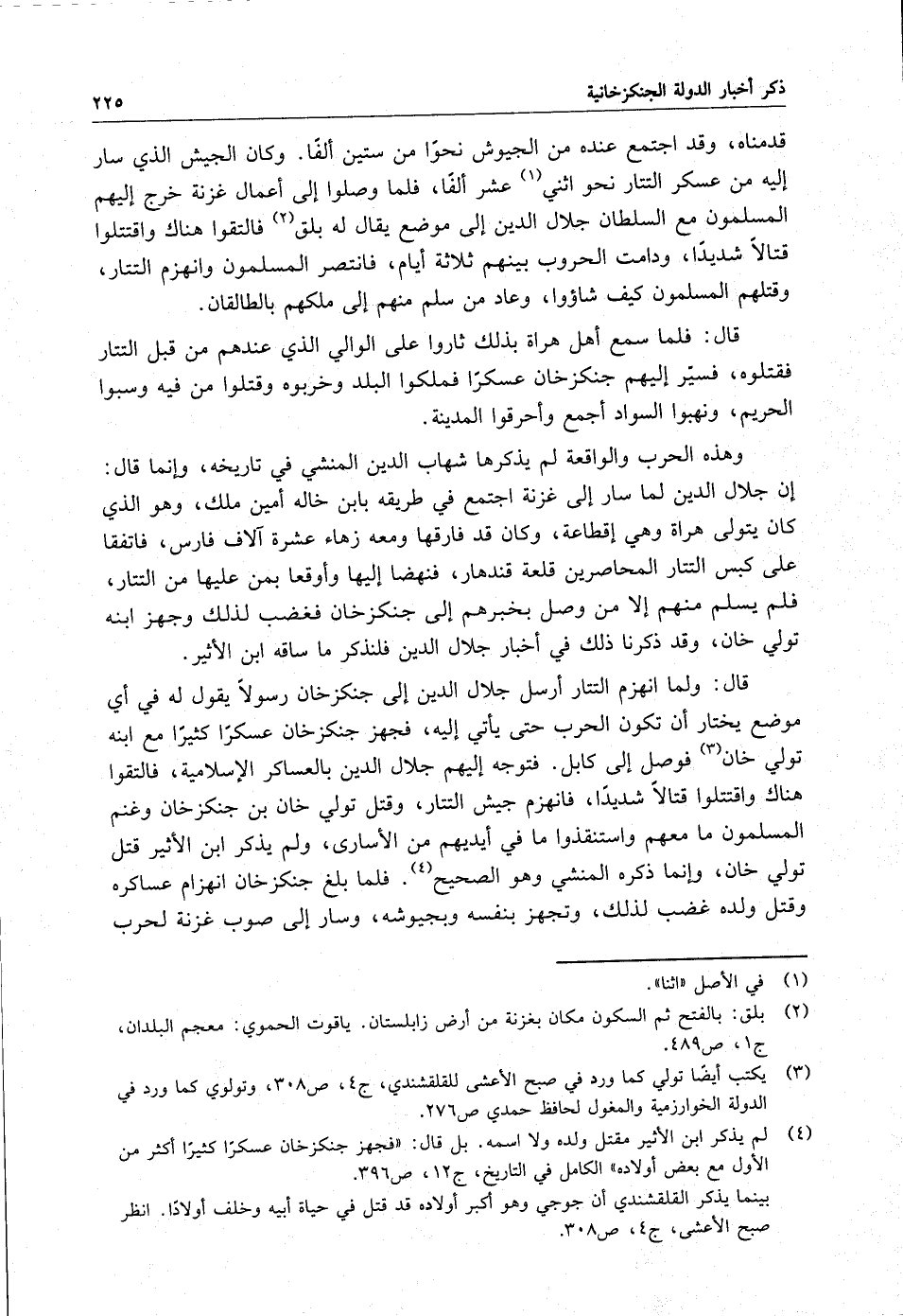 وهذه الحرب والواقعة لم يذكرها شهاب الدين المنشي في تاريخه ، وإنما قال : إن جلال الدين لما سار إلى غزنة اجتمع في طريقه بابن خاله أمين ملك ، وهو الذي كان يتولى هراة وهي إقطاعة ، وكان قد فارقها ومعه زهاء عشرة آلاف فارس ، فاتفقا على كبس التتار المحاصرين قلعة قندهار ، فنهضا إليها وأوقعا بمن عليها من التتار ، فلم يسلم منهم إلا من وصل بخبرهم إلى جنكزخان فغصب لذلك وجهز ابنه تولى خان ، وقد ذكرنا ذلك في أخبار جلال الدين فلنذكر ما ساقه ابن الأثير .