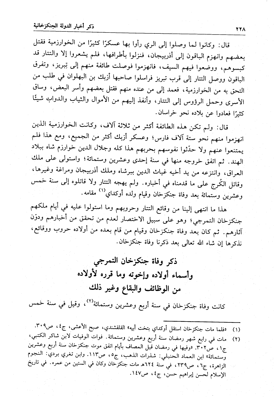 هذا ما انتهى إلينا من وقائع التتار وحروبهم وما استولوا عليه في أيام ملكهم جنكزخان التمرجي ؛ وهو على سبيل الاختصار لعدم أن تحقق من أخبارهم ويدون آثارهم . ثم كان بعد وفاة جنكزخان وقيام من قام بعده من أولاده حروب ووقائع ، نذكرها إن شاء الله تعالى بعد ذكرنا وفاة جنكزخان .