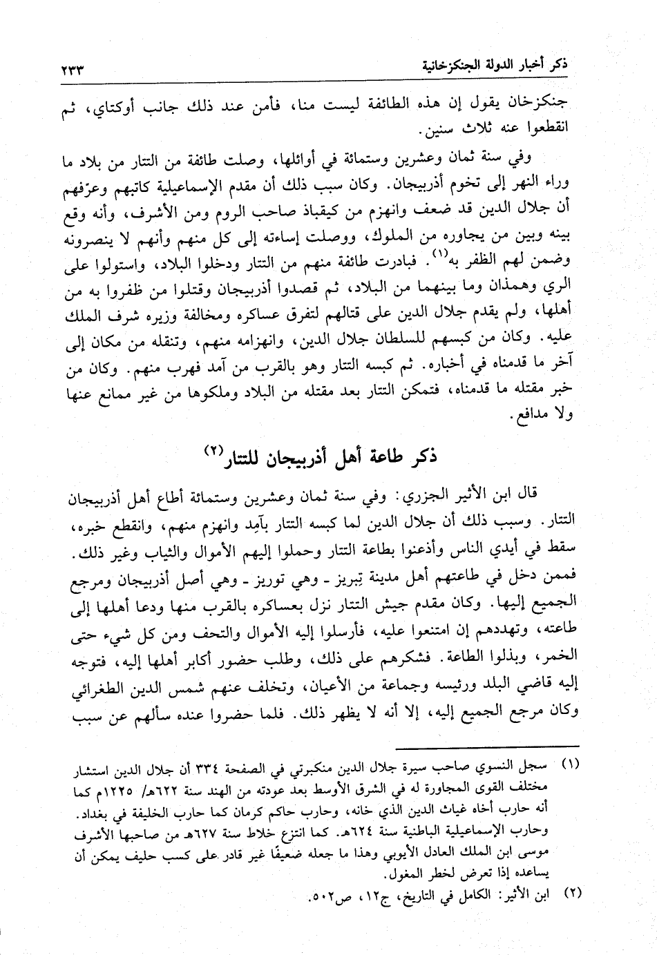 جنكزخان يقول إن هذه الطائفة ليست منا ، فأمن عند ذلك جانب أوكتاي ، ثم انقطعوا عنه ثلاث سنين . وفي سنة ثمانة وعشرين وستمائة في أوائلها ، وصلت طائفة من التتار من بلاد ما وراء النهر إلى تخوم أذربيجان . وكان سبب ذلك أن مقدم الاسماعيلية كاتبهم وعرفهم أن جلال الدين قد ضعف وانهزم من كيقباذ صاحب الروم ومن الأشرف ، وأنه وقع بينه وبين من يجاوره من الملوك ، ووصلت إساءته إلى كل منهم وأنهم لا ينصرونه وضمن لهم الظفر به . فبادرت طائفة منهم من التتار ودخلوا البلاد ، واستولوا على الري وهمذان وما بينهما من البلاد ، ثم قصدوا أذربيجان وقتلوا من ظفروا به من أهلها ، ولم يقدم جلال الدين على قتالهم لتفرق عساكره ومخالفة وزيره شرف الملك عليه . وكان من كبسهم للسلطان جلال الدين ، وانهزامه منهم ، وتنقله من مكان إلى آخر ما قدمناه في أخباره . ثم كبسه التتار وهو بالقرب من آمد فهرب منهم . وكان من خبر مقتله ما قدمناه ، فتمكن التتار بعد مقتله من البلاد وملكوها من غير ممانع عنها ولا مدافع .