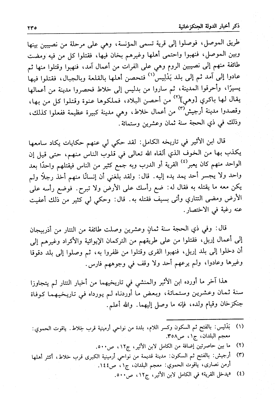 هذا آخر ما أورده ابن الأثير والمنشي في تاريخيهما من أخبار التتار لم يتجاوزا سنة ثمان وعشرين وستمائة ، وبعض ما أوردناه لم يورداه في تاريخيهما كوفاة جنكزخان وقيام ولده ، فإنه ما وصل إليهما . والله أعلم .