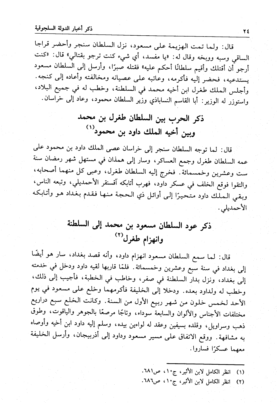 قال : لما توجه السلطان سنجر إلى خراسان عصى الملك داود بن محمود على عمه السلطان طغرل ، وجمع العساكر ، وسار إلى همذان في مستهل شهر رمضان سنة ست وعشرين وخمسمائة . فخرج إليه السلطان طغرل ، وعبى كل منهما أصحابه ، والتقوا فوقع الخلف في عسكر داود ، فهرب أتابكة أق سنقر الأحمديلي ، وتبعه الناس ، وبقي الملك داود متحيراً إلى أوائل ذي الحجة منها فقدم بغداد هو وأتابكة الأحمديلي .