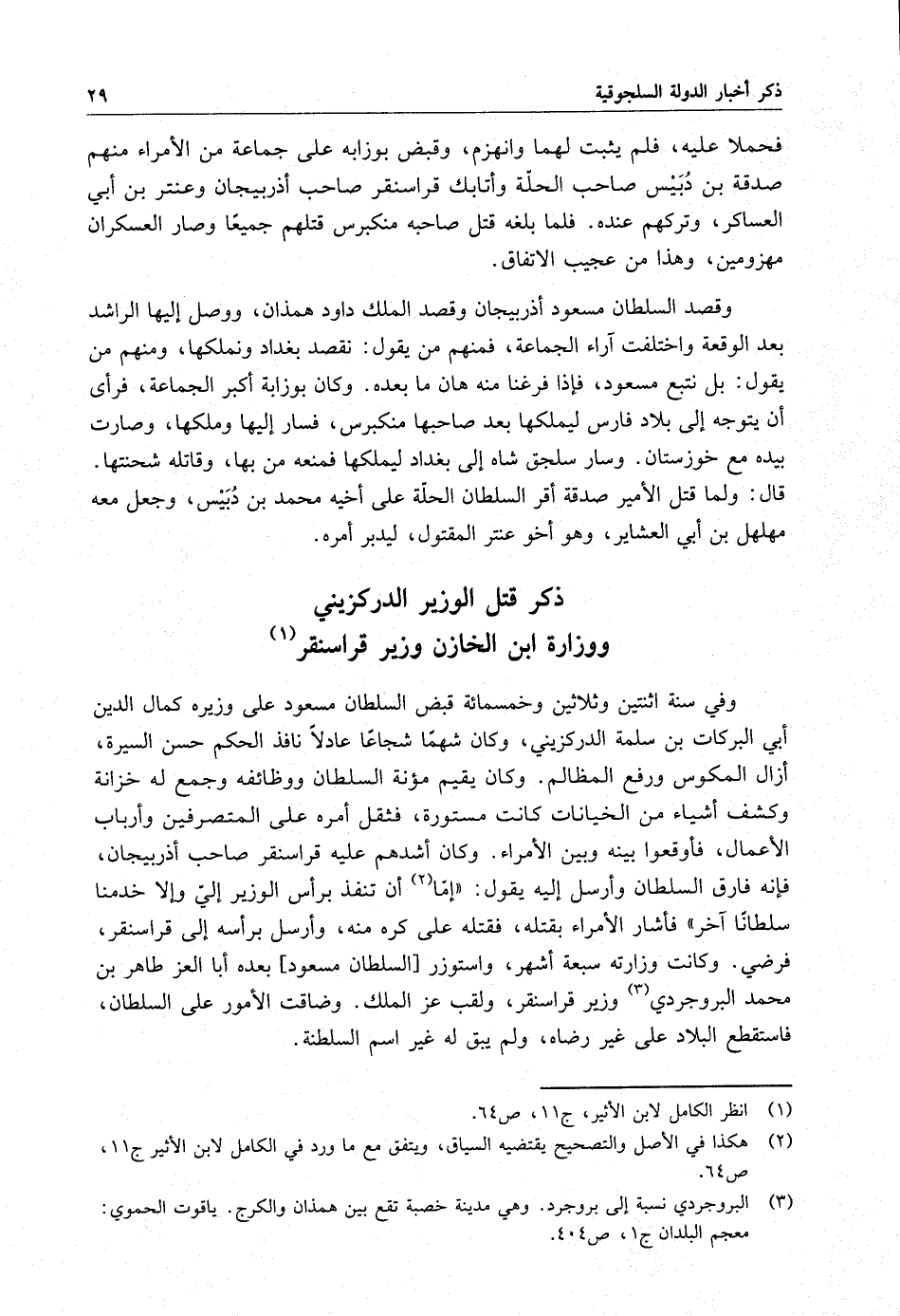 وفي سنة اثنتين وثلاثين وخمسمائة قبض السلطان مسعود على وزيره كمال الدين أبي البركات بن سلمة الدركزيني ، وكان شهماً شجاعاً عادلاً نافذ الحكم حسن السيرة ، أزال المكوس ورفع المظالم . وكان يقيم مؤنة السلطان ووظائفه وجمع له خزانة وكشف أشياء من الخانات كانت مستورة ، فثقل أمره على المتصرفين وأرباب الأعمال ، فأوقعوا بينه وبين الأمراء . وكان أشدهم عليه قرا سنقر صاحب أذربيجان ، فإنه فارق السلطان وأرسل إليه يقول : أما أن تنفذ برأس الوزير إلي وإلا خدمنا سلطاناً آخر فأشار الأمراء بقتله ، فقتله على كره منه ، وأرسل برأسه إلى قرا سنقر ، فرضى وكانت وزارته سبعة أشهر ، واستوزر السلطان مسعود بعده أبا العز طاهر بن محمد البروجردي وزير قراسنقر ، ولقب عز الملك . وضاقت الأمور على السلطان ، فاستقطع البلاد على غير رضاه ، ولم يبق له غير اسم السلطنة .