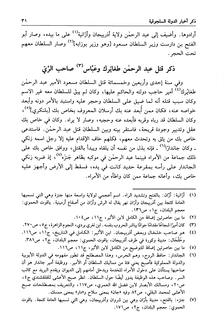 وفي سنة إحدى وأربعين وخمسمائة قتل السلطان مسعود الأمير عبد الرحمن طفايرك أمير حاجب دولته والحاكم عليها ، وكان لم يبق للسلطان معه غير الاسم ، وكان سبب قتله أنه لما ضيق على السلطان وحجز عليه واستبد بالأمر دونه وأبعد خواصه عنه ، فكان ممن أبعد عنه بك أرسلان المعروف بخاص بك ، وكان السلطان قد رباه وقربه فأبعده عنه وحجبه ، وصار لايراه . وكان في خاص بك عقل وتدبير وجودة قريحة ، فاستقر بينه وبين السلطان قتل عبد الرحمن . فاستدعى خاص بك من يثق به وتحدث معهم ، فكلهم خاف الإقدام عليه إلا رجل اسمه زنكي - وكان جان دارا - فإنه بذل من نفسه أن يلقاه ويبدأه بالقتل ، ووافق خاص بك على ذلك جماعة من الأمراء فبينما عبد الرحمن في موكبه بظاهر جنزه ، إذ ضربه زنكي الجان دار على رأسه بمقرعة حديد كانت في يده ، فسقط إلى الأرض وأجهز عليه خاص بك ، وأعانه جماعة ممن كان واطأه من الأمراء .