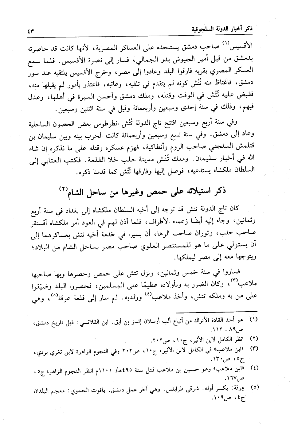 الأقسيس صاحب دمشق يستنجده على العساكر المصرية ، لأنها كانت قد حاصرته بدمشق من قبل أمير الجيوش بدار الجمالي ، فسار إلى نصرة الأقسيس . فلما سمع العسكر المصري بقربه فارقوا البلد وعادوا إلى مصر ، وخرج الأقسيس يلتقيه عند سور دمشق ، فاغتاظ منه تتش كونه لم يتقدم في تلقيه ، وعاتبه ، فاعتذر بأمور لم يقبلها منه ، فقبض عليه تتش في الوقت وقتله ، وملك دمشق وأحسن السيرة في أهلها ، وعدل فيهم ، وذلك في سنة إحدى وسبعين وأربعماية وقيل في سنة اثنين وسبعين . وفي سنة أربع وسبعين افتتح تاج الدولة تتش الطرطوس بعض الحصون الساحلية وعاد إلى دمشق . وفي سنة تسع وسبعين وأربعماية كانت الحرب بينه وبين سليمان بن قتلمش السلجقي صاحب الروم وإنطاكية ، فهزم عسكره وقتله على ما نذكره إن شاء الله في أخبار سليمان . وملك تتش مدينة حلب خلا القلعة ، فكتب العقابي إلى السلطان ملكشاه يستدعيه ، فوصل إليها وفارقها تطش كما قدمنا ذكره .