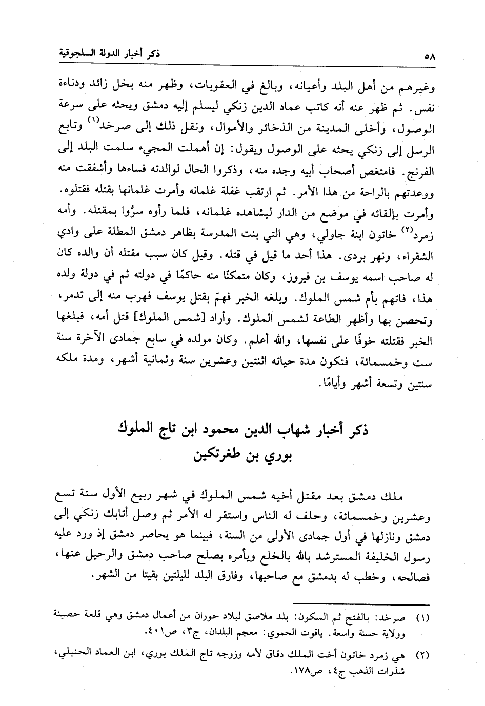 وغيرهم من أهل البلد وأعيانه ، وبالغ في العقوبات ، وظهر منه بخل زائد ودناءة نفس . ثم ظهر عنه أنه كاتب عماد الدين زنكي ليسلم إليه دمشق ويحثه على سرعة الوصول ، وأخلى المدينة من الذخائر والأموال ، ونقل ذلك إلى صرخد وتابع الرسل إلى زنكي يحثه على الوصول ويقول : إن أهملت المجيء سلمت البلد إلى الفرنج . فامتعض أصحاب أبيه وجده منه ، وذكروا الحال لوالدته فساءها وأشفقت منه ووعدتهم بالراحة من هذا الأمر . ثم ارتقب غفلة غلمانه وأمرت غلمانها بقتله فقتلوه . وأمرت بإلقائه في موضع من الدار ليشاهده غلمانه ، فلما رأوه سروا بمقتله . وأمه زمود خاتون ابنة جاولي ، وهي التي بنت المدرسة بظاهر دمشق المطلة على وادي الشقراء ، ونهر بردى . هذا أحد ما قيل في قتله .