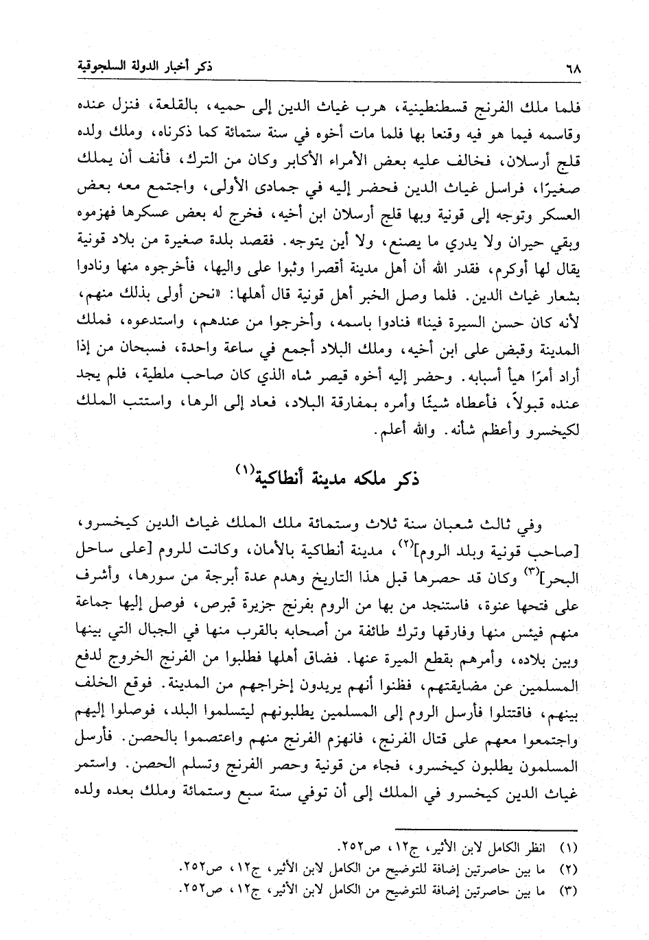 وفي ثالث شعبان سنة ثلاث ستماية ملك الملك غياث الدين كيخسروا مدينة أنطاكية بالأمان ، وكانت للروم . وكان قد حصرها قبل هذا التاريخ وهدم عدة أبرجة من سنورها ، وأشرف على فتحها عنوة ، فاستنجد من بها من الروم بفرنج جزيرة قبرص ، فوصل إليها جماعة منهم فيئس منها وفارقها وترك طائفة من أصحابه بالقرب منها في الجبال التي بينها وبين بلاده ، وأمرهم بقطع الميرة عنها . فضاق أهلها فطلبوا من الفرنج الخروج لدفع المسلمين عن مضايقتهم ، فظنوا أنهم يريدون إخراجهم من المدينة . فوقع الخلف بينهم ، فاقتتلوا فأرسل الروم إلى المسلمين يطلبونهم ليتسلموا البلد ، فوصلوا إليهم واجتمعوا معهم على قتال الفرنج ، فانهزم الفرنج منهم واعتصموا بالحصن . فأرسل المسلمون يطلبون كيخسرو ، فجاء من قونية وحصر الفرنج وتسلم الحصن . واستمر غياث الدين كيخسرو في الملك إلى أن توفي سنة سبع وستماية وملك بعده ولده