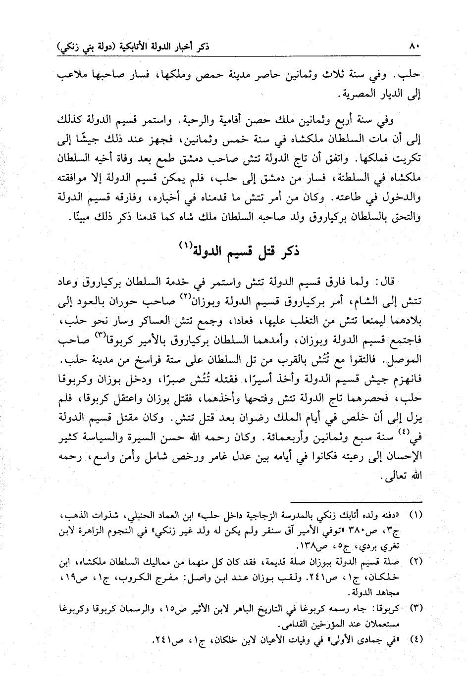 قال : ولما فارق قسيم الدولة تتش واستمر في خدمة السلطان بركياروق وعاد تتش إلى الشام ، أمر بركياروق قسيم الدولة وبوزان صاحب حوران بالعود إلى بلادهما ليمنعا تتش من التغلب عليهما ، فعادا ، وجمع تتش العساكر وسار نحو حلب ، فاجتمع قسيم الدولة وبوزان ، وأمدهما السلطان بركياروق بالأمير كربوقا صاحب الموصل . فالتقوا مع تتش بالقرب من تل السلطان على ستة فراسخ من مدينة حلب . فانهزم جيش قسيم الدولة وأخذ أسيراً ، فقتله تتش صبرا ، ودخل بوزان وكربوقا حلب ، فحصرهما تاج الدولة تتش وفتحها وأخذهما ، فقتل بوزان واعتقل كربوقا ، فلم يزل إلى أن خلص في أيام الملك رضوان بعد قتل تتش . وكان مقتل قسيم الدولة في سنة سبع وثمانين وأربعماية . وكان رحمه الله حسن السيرة والسياسة كثير الإحسان إلى رعيته فكانوا في أيامه بين عدل غامر ورخص شامل وأمن واسع ، رحمه الله تعالى .