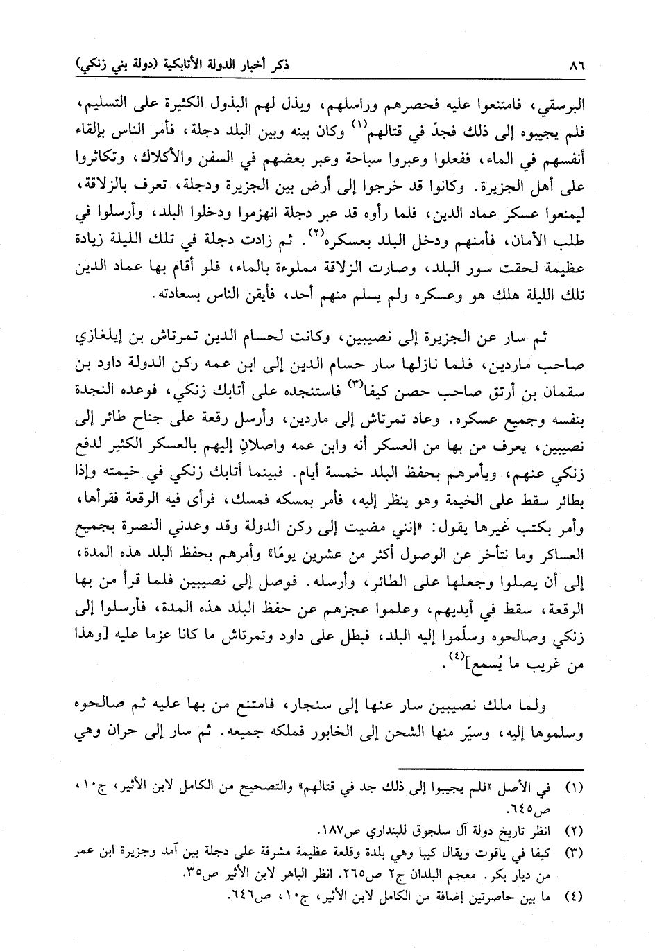 البرسقي ، فامتنعوا عليه فحصرهم وراسلهم ، وبذل لهم البذول الكثيرة على التسليم ، فلم يجيبوه إلى ذلك فجد في قتالهم . وكان بينه وبين البلد دجلة ، فأمر الناس بإلقاء أنفسهم في الماء ، ففعلوا وعبروا سباحة وعبر بعضهم في السفن والأكلاك ، وتكاثروا على أهل الجزيرة . وكانوا قد خرجوا إلى أرض بين الجزيرة ودجلة ، تعرف بالزلاقة ، ليمنعوا عسكر عماد الدين ، فلما رأوه قد عبر دجلة انهزموا ودخلوا البلد ، وأرسلوا في طلب الأمان ، فأمنهم ودخل البلد بعسكره . ثم زادت دجلة في تلك الليلة زيادة عظيمة لحقت سور البلد ، وصارت الزلاقة مملوءة بالماء ، فلو أقام بها عماد الدين تلك الليلة هلك هو وعسكره ولم يسلم منهم أحد ، فأيقن الناس بسعادته . ثم سار عن الجزيرة إلى نصيبين ، وكانت لحسام الدين تمرتاش ابن إيلغازي صاحب ماردين ، فلما نازلها سار حسام الدين إلى ابن عمه ركن الدولة داود بن سقمان بن أرتق صاحب حصن كيفا فاستنجده على أتابك زنكي ، فوعده النجدة بنفسه وجميع عسكره . وعاد تمرتاش إلى ماردين ، وأرسل رقعة على جناح طائر إلى نصيبين ، يعرف من بها من العسكر أنه وابن عمه واصلان إليهم بالعسكر الكثير لدفع زنكي عنهم ، ويأمرهم بحفظ البلد خمسة أيام . فبينما أتابك زنكي في خيمته وإذا بطائر سقط على الخيمة وهو ينظر إليه ، فأمر بمسكه فمسك ، فرأى فيه الرقعة فقرأها ، وأمر بكتب غيرها يقول : إنني مضيت إلى ركن الدولة وقد وعدني النصرة بجميع العساكر وما نتأخر عن الوصول أكثر من عشرين يوماً وأمرهم بحفظ البلد هذه المدة ، إلى أن يصلوا وجعلها على الطائر ، وأرسله . فوصل إلى نصيبين فلما قرأ من بها الرقعة ، سقط في أيديهم ، وعلموا عجزهم عن حفظ البلد هذه المدة ، فأرسلوا إلى زنكي وصالحوه وسلموا إليه البلد ، فبطل على داود وتمرتاش ما كانا عزما عليه .