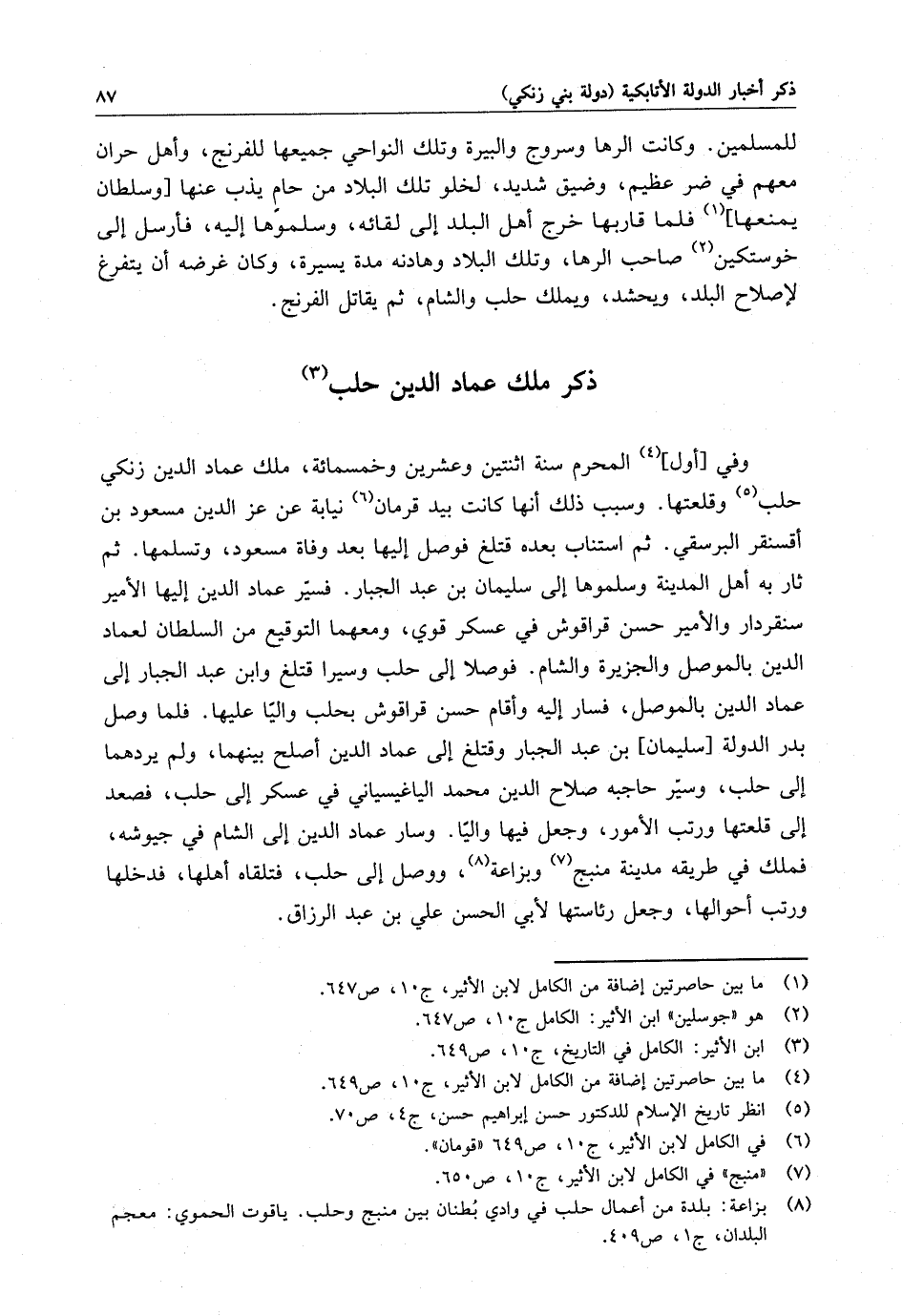 للمسلمين . وكانت الرها وسروج والبيرة وتلك النواحي جميعها للفرنج ، وأهل حران معهم في ضر عظيم ، وضيق شديد ، لخلو تلك البلاد من حامي يذب عنها . فلما قاربها خرج أهل البلد إلى لقائه ، وسلموها إليه ، فأرسل إلى خوستكين صاحب الرها ، وتلك البلاد وهادنه مدة يسيرة ، وكان غرضه أن يتفرغ لإصلاح البلد ، ويحشد ، ويملك حلب والشام ، ثم يقاتل الفرنج .