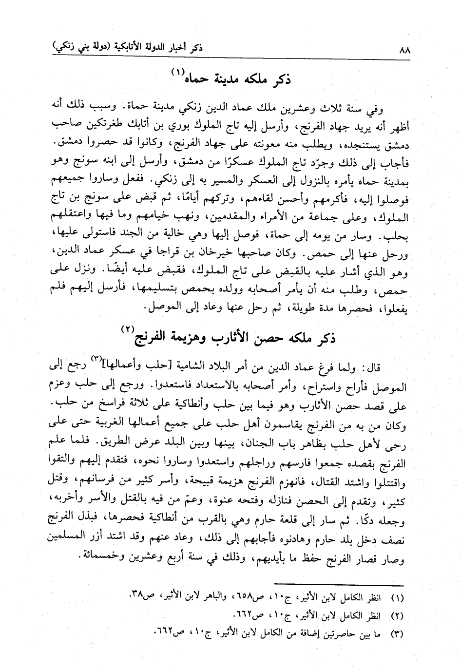 وفي سنة ثلاث وعشرين ملك عماد الدين زنكي مدينة حماة . وسبب ذلك أنه أظهر أنه يريد جهاد الفرنج ، وأرسل إليه تاج الملوك بوري بن أتابك طغرتكين صاحب دمشق يستنجده ، ويطلب منه معونته على جهاد الفرنج ، وكانوا قد حصروا دمشق . فأجاب إلى ذلك وجرد تاج الملوك عسكراً من دمشق ، وأرسل إلى ابنه سونج وهو بمدينة حماه يأمره بالنزول إلى العسكر والمسير به إلى زنكي . ففعل وساروا جميعهم فوصلوا إليه ، فأكرمهم وأحسن لقاءهم ، وتركهم أياماً ، ثم قبض على سونج بن تاج الملوك ، وعلى جماعة من الأمراء والمقدمين ، وأنهب خيامهم وما فيها واعتقلهم بحلب . وسار من يومه إلى حماة ، فوصل إليها وهي خالية من الجند فاستولى ، عليها ، وحل عنها إلى حمص . وكان صاحبها خيرخان بن قراجا في عسكر عماد الدين ، وهو الذي أشار عليه بالقبض على تاج الملوك ، فقبض عليه أيضاً . ونزل على حمص ، وطلب منه أن يأمر أصحابه وولده بحمص بتسليمها ، فأرسل إليهم فلم يفعلوا ، فحصرها مدة طويلة ، ثم رحل عنها وعاد إلى الموصل .