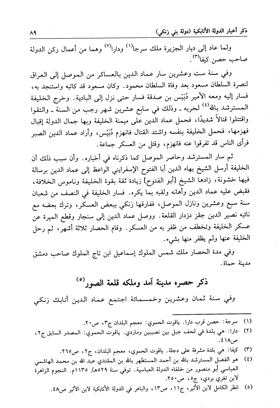 ثم سار المسترشد وحاصر الموصل كما ذكرناه في أخباره . وأن سبب ذلك أن الخليفة أرسل الشيخ بهاء الدين أبا الفتوح الاسفرايني الواعظ إلى عماد الدين برسالة فيها خشونة ، زادها الشيخ أبو الفتوح زيادة ثقة بقوة الخليفة وناموس الخلافة ، فقبض عليه عماد الدين وأهانه ولقبه بما يكره . فسار الخليفة في النصف من شعبان سنة سبع وعشرين ونازل الموصل ، ففارقها زنكي ببعض العسكر ، وترك بعضه مع نائبه نصير الدين جقز دزدار القلعة . ووصل عماد الدين إلى سنجار وقطع الميرة عن عسكر الخليفة وتخطف من ظفر به من العسكر . وقام الحصار ثلاثة أشهر ، ثم رحل الخليفة عنها ولم يظفر منها بشيء .