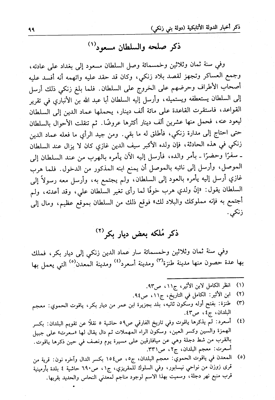وفي سمو ثمان وثلاثين وخمسماية سار عماد الدين زنكي إلى ديار بكر ، فملك بها عدة حصون منها مدينة طنزة ومدينة أسعرد ومدينة المعدن التي يعمل بها