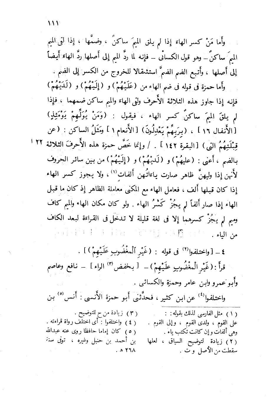 وَإِنَّمَا خص حَمْزَة هَذِه الأحرف الثَّلَاثَة بِالضَّمِّ أَعنِي {عَلَيْهِم} و {لديهم} و {إِلَيْهِم} من بَين سَائِر الْحُرُوف لِأَنَّهُنَّ إِذا وليهن ظَاهر صَارَت ياءاتهن ألفات وَلَا يجوز كسر الْهَاء إِذا كَانَ قبلهَا ألف فعامل الْهَاء مَعَ المكنى مُعَاملَة الظَّاهِر إِذْ كَانَ مَا قبل الْهَاء إِذا صَار ألفا لم يجز كسر الْهَاء