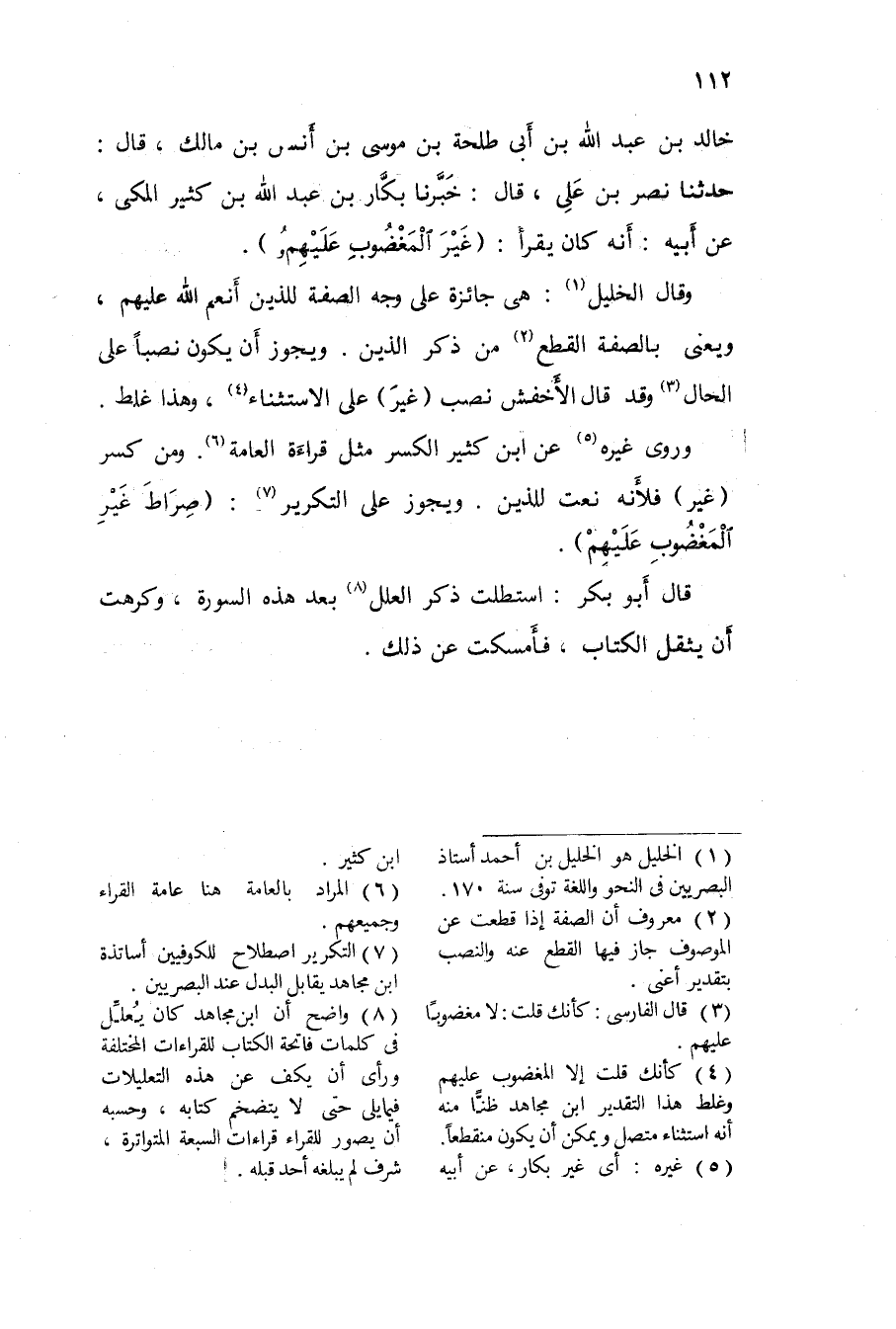 حَدثنَا نصر بن عَليّ قَالَ خبرنَا بكار بن عبد الله بن يحيى العوذي عَن الْخَلِيل بن أَحْمد قَالَ سَمِعت عبد الله بن كثير الْمَكِّيّ أَنه كَانَ يقْرَأ {غير المغضوب عَلَيْهِم} وَقَالَ الْخَلِيل وَهِي جَائِزَة على وَجه الصّفة للَّذين أنعم الله عَلَيْهِم يَعْنِي بِالصّفةِ الْقطع من ذكر الَّذين