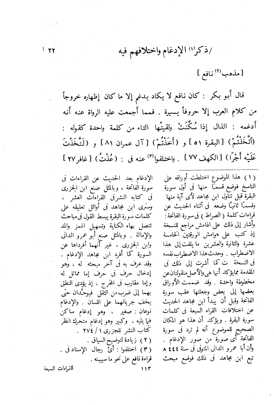 قَالَ أَبُو بكر كَانَ نَافِع لَا يكَاد يدغم إِلَّا مَا كَانَ إِظْهَاره خُرُوجًا من كَلَام الْعَرَب إِلَّا حروفا يسيرَة