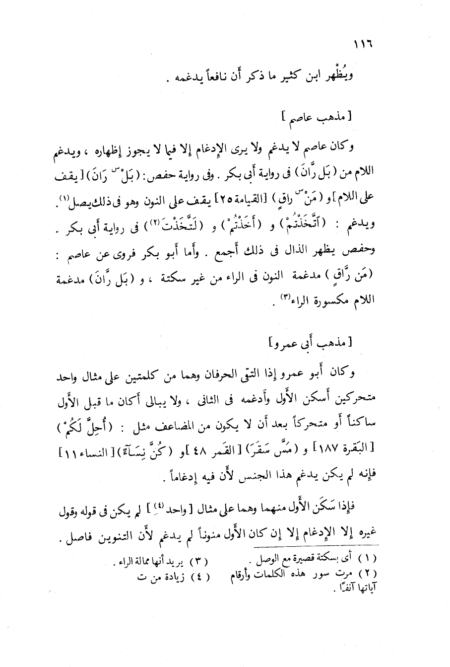 وَكَانَ عَاصِم لَا يدغم وَلَا يرى الْإِدْغَام إِلَّا فِيمَا لَا يجوز إِظْهَاره ويدغم اللَّام من {بل ران} فِي رِوَايَة أبي بكر