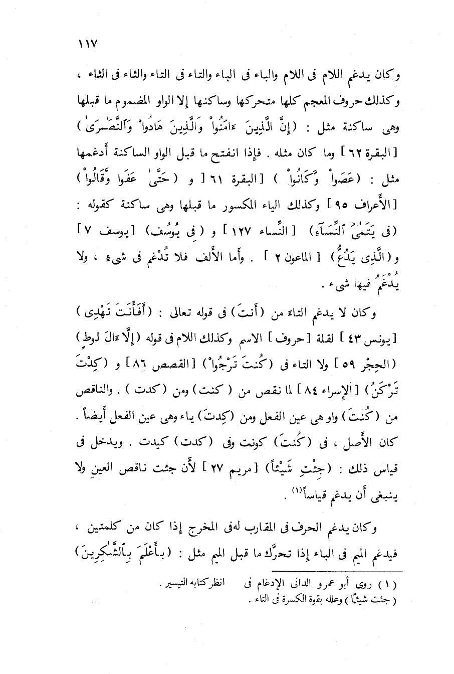 وَكَانَ يدغم اللَّام فِي اللَّام وَالْبَاء فِي الْبَاء وَالتَّاء فِي التَّاء والثاء فِي الثَّاء وَكَذَلِكَ حُرُوف المعجم كلهَا متحركها وساكنها إِلَّا الْوَاو المضموم مَا قبلهَا وَهِي سَاكِنة مثل {إِن الَّذين آمنُوا وَالَّذين هادوا وَالنَّصَارَى} الْبَقَرَة 62 وَمَا كَانَ مثله