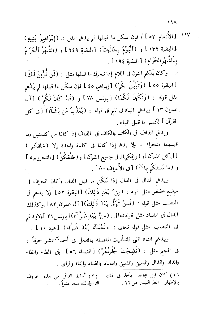 وَكَانَ يدغم الْحَرْف فِي المقارب لَهُ فِي الْمخْرج إِذا كَانَا من كَلِمَتَيْنِ فيدغم الْمِيم فِي الْبَاء إِذا تحرّك مَا قبل الْمِيم مثل {بِأَعْلَم بِالشَّاكِرِينَ} الْأَنْعَام 53 فَإِن سكن مَا قبلهَا لم يدغم مثل {إِبْرَاهِيم بنيه} الْبَقَرَة 132 و {الْيَوْم بجالوت} الْبَقَرَة 249 و {الشَّهْر الْحَرَام بالشهر الْحَرَام} الْبَقَرَة 194