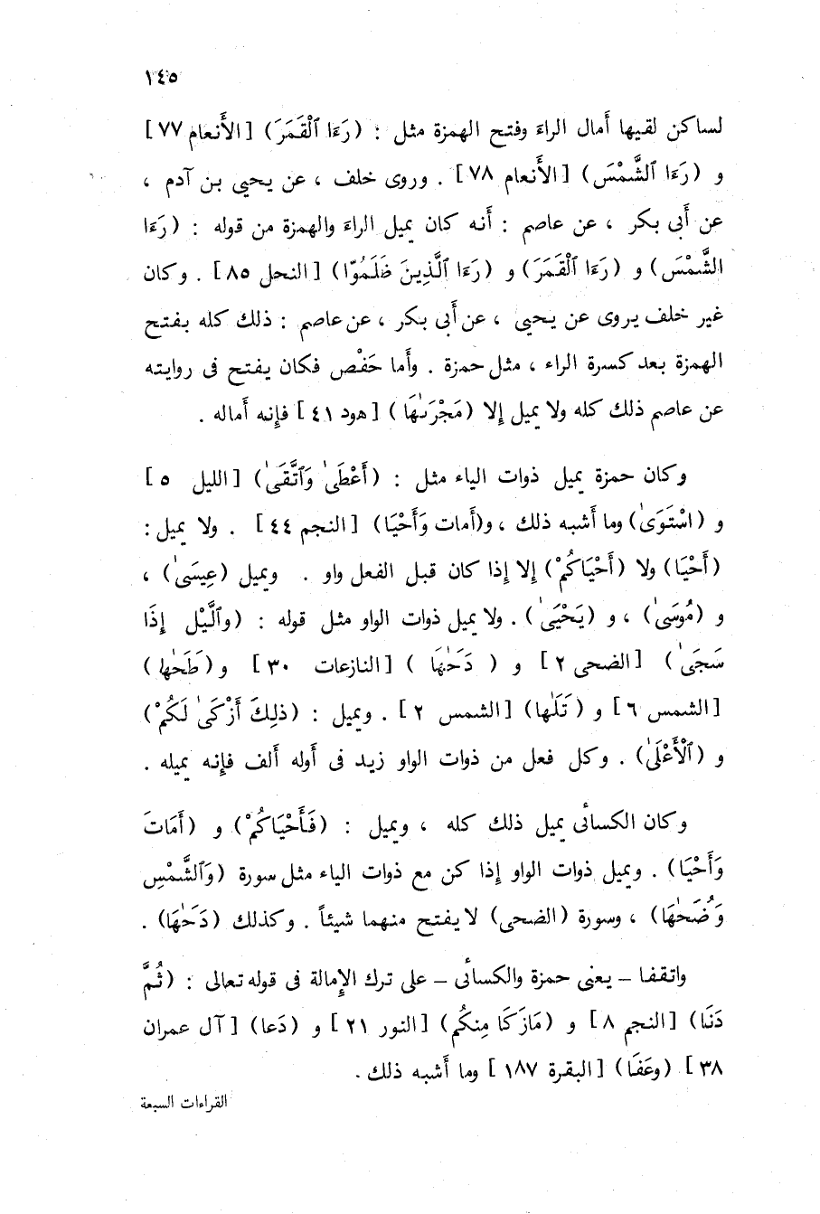 وَأما أَبُو عَمْرو فَكَانَ يقْرَأ من ذَلِك مَا كَانَ فِي رُءُوس الْآي بَين الْكسر وَالْفَتْح مثل آيَات سُورَة طه والنجم و {عبس وَتَوَلَّى} {وَالضُّحَى} {وَاللَّيْل إِذا يغشى} {وَالشَّمْس وَضُحَاهَا} . . و {دحاها} . . و {طحاها} فَإِذا لم يكن رَأس آيَة فتح مثل {قضى أَََجَلًا} الْأَنْعَام 2 و {الْهدى} و {اسْتَوَى إِلَى السَّمَاء} الْبَقَرَة 29 و {أزكى لكم} الْبَقَرَة 232 و {فسواهن} الْبَقَرَة 29 و (أَحْيَا) فَإِنَّهُ بِالْفَتْح كُله