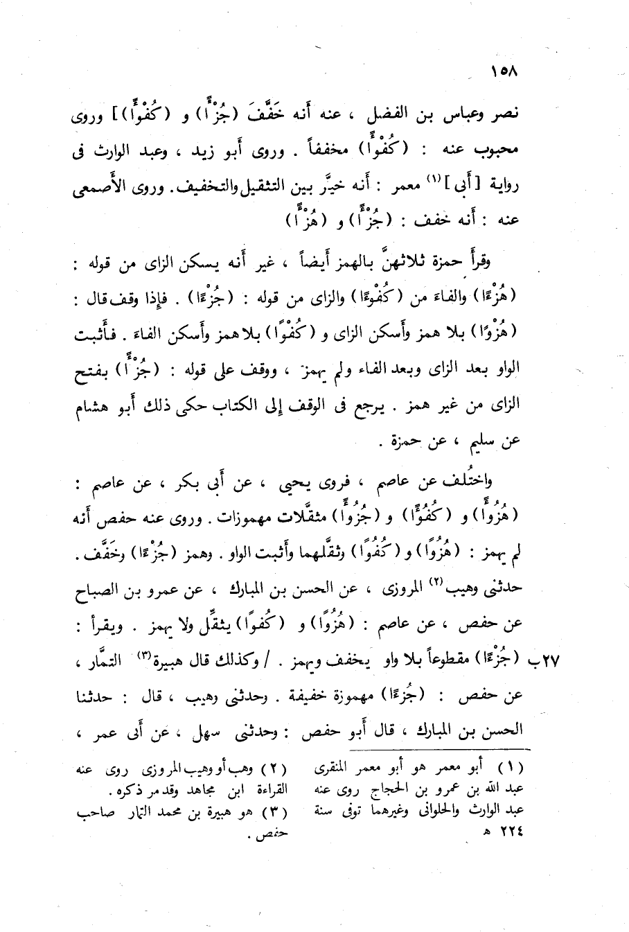 وروى عَليّ بن نصر وعباس بن الْفضل عَنهُ أَنه خفف / جزأ / و (كُفؤًا) وروى مَحْبُوب عَنهُ / كُفؤًا / مخففا