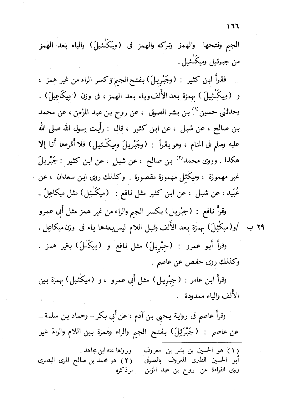 وحَدثني حُسَيْن بن بشر الصُّوفِي عَن روح بن عبد الْمُؤمن عَن مُحَمَّد بن صَالح عَن شبْل عَن ابْن كثير قَالَ رَأَيْت رَسُول الله صلى الله عَلَيْهِ وَسلم فِي الْمَنَام وَهُوَ يقْرَأ / وَجِبْرِيل وميكئيل / بِكَسْر الْجِيم وَالرَّاء فَلَا أقرءها أَنا إِلَّا هَكَذَا