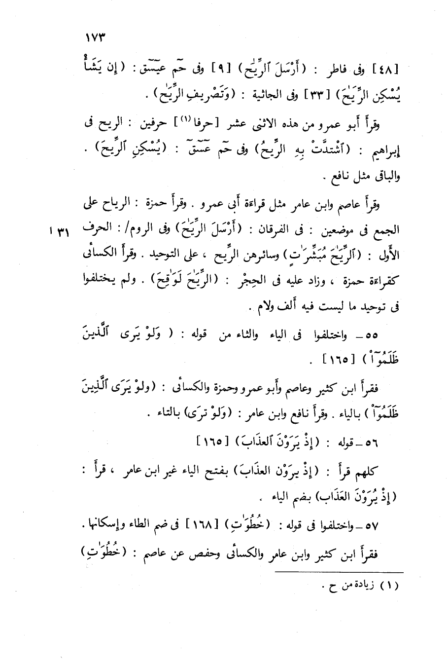وَقَرَأَ حَمْزَة الرّيح على الْجمع فِي موضِعين فِي الْفرْقَان / أرسل الرّيح / وَفِي الرّوم الْحَرْف الأول / الرّيح مُبَشِّرَات / وسائرهن الرّيح على التَّوْحِيد
