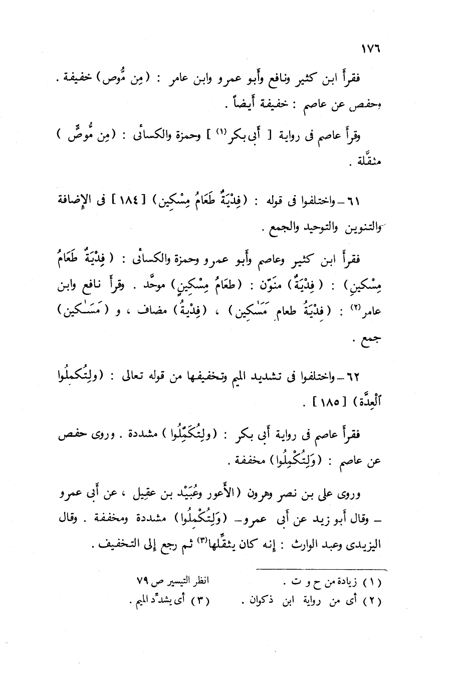 62 - وَاخْتلفُوا فِي تَشْدِيد الْمِيم وتخفيفها من قَوْله تَعَالَى {ولتكملوا الْعدة} 185