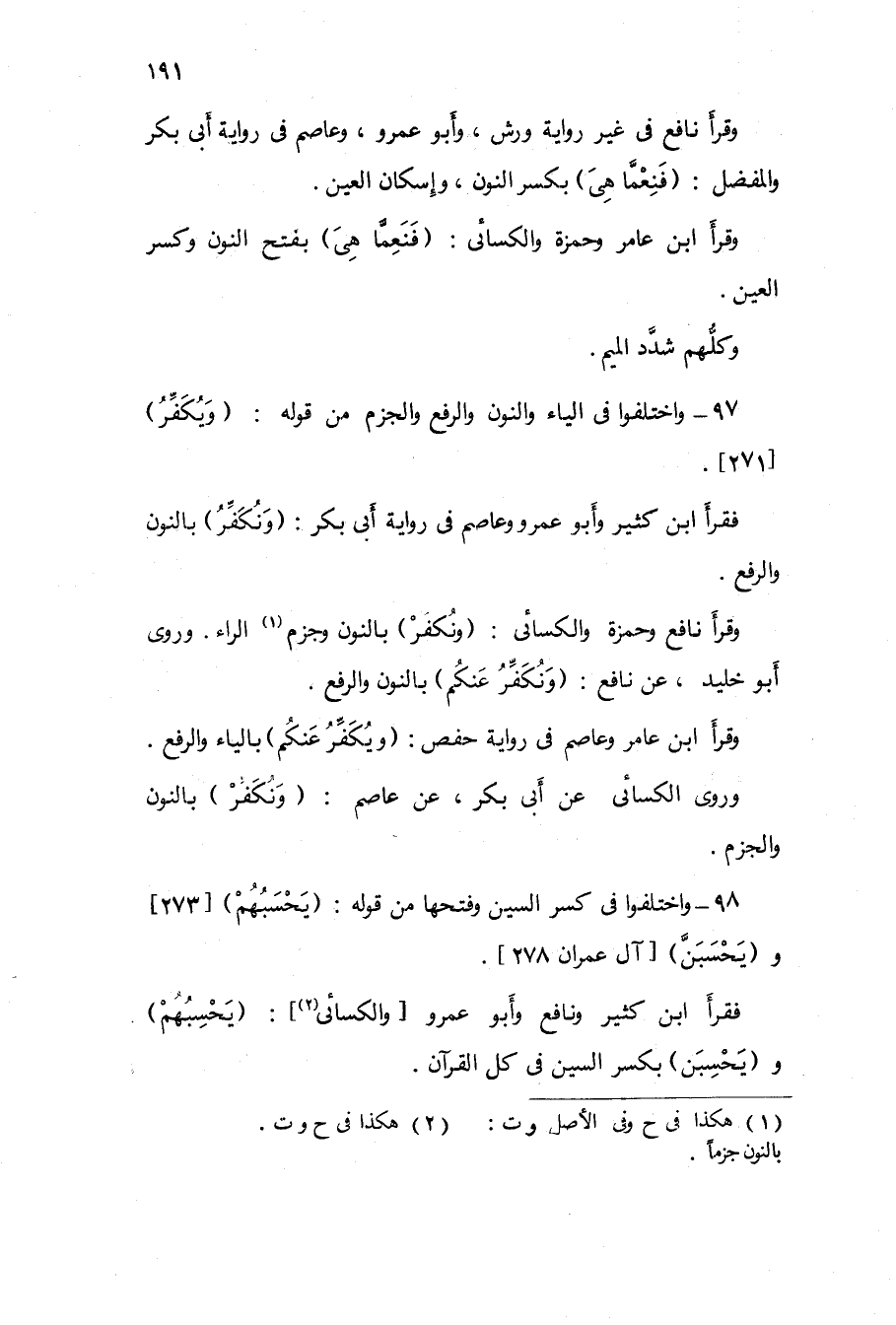 97 - وَاخْتلفُوا فِي الْيَاء وَالنُّون وَالرَّفْع والجزم من قَوْله {وَيكفر} 271