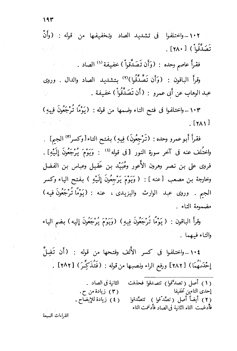 104 - وَاخْتلفُوا فِي كسر الْألف وَفتحهَا من قَوْله {أَن تضل إِحْدَاهمَا} 282 وَرفع الرَّاء ونصبها من قَوْله {فَتذكر} 282