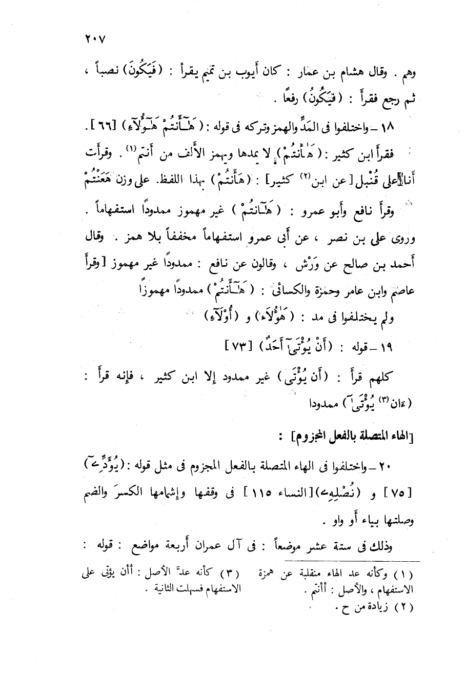 20 - وَاخْتلفُوا فِي الْهَاء الْمُتَّصِلَة بِالْفِعْلِ المجزوم فِي مثل قَوْله {يؤده} 75 و {ونصله} النِّسَاء 115 فِي وَقفهَا وإشمامها الْكسر وَالضَّم وصلتها بياء أَو وَاو