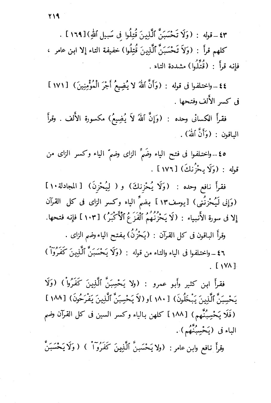 46 - وَاخْتلفُوا فِي الْيَاء وَالتَّاء من قَوْله {وَلَا يَحسبن الَّذين كفرُوا} 178