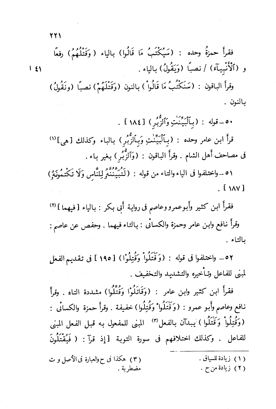 52 - وَاخْتلفُوا فِي قَوْله {وقاتلوا وَقتلُوا} 195 فِي تَقْدِيم الْفِعْل الْمَبْنِيّ للْفَاعِل وتأخيره وَالتَّشْدِيد وَالتَّخْفِيف