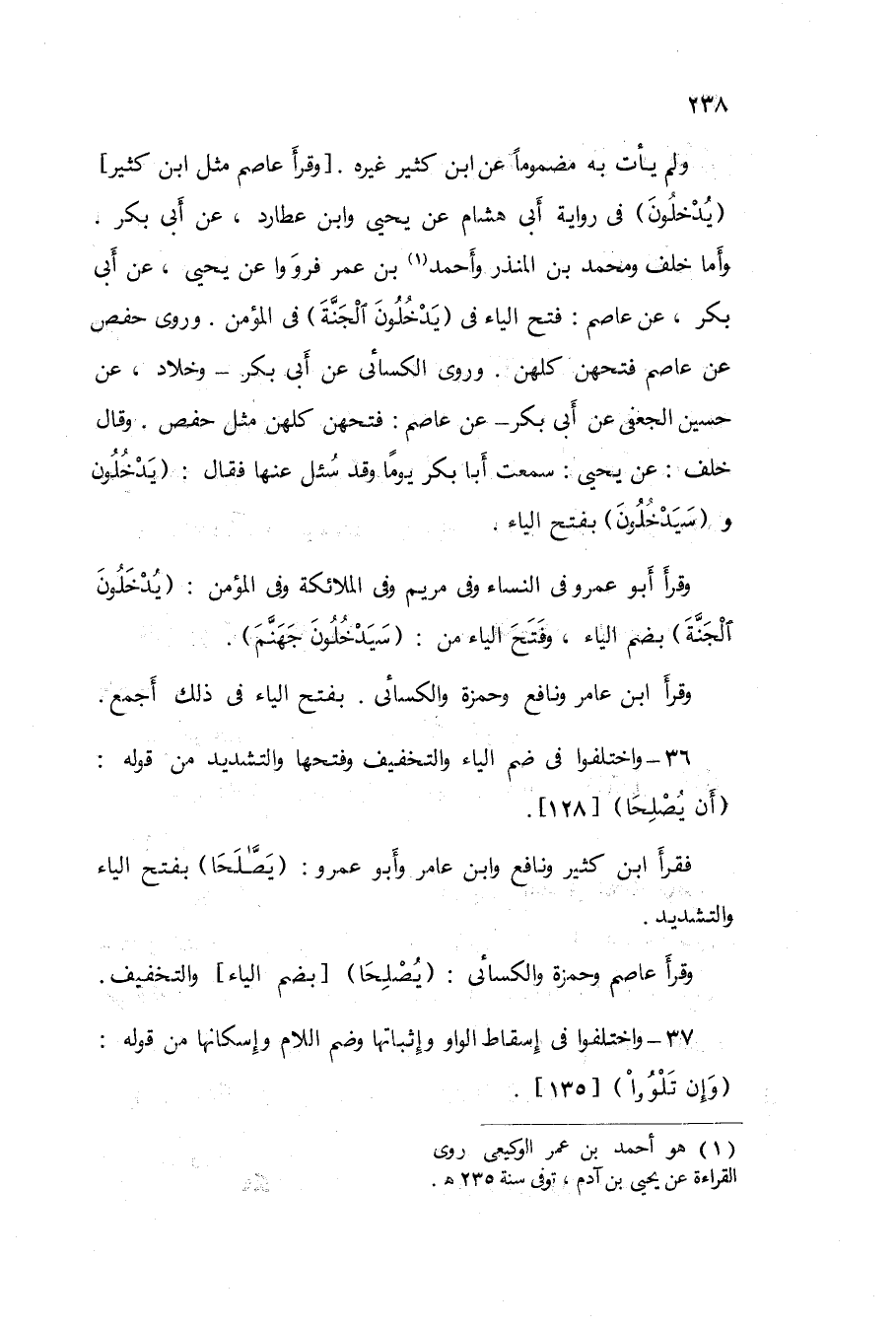 وَأما خلف وَمُحَمّد بن الْمُنْذر وَأحمد بن عمر فرووا عَن يحيى عَن أَبى بكر عَن عَاصِم فتح الْيَاء فى {يدْخلُونَ الْجنَّة} فى الْمُؤمن
