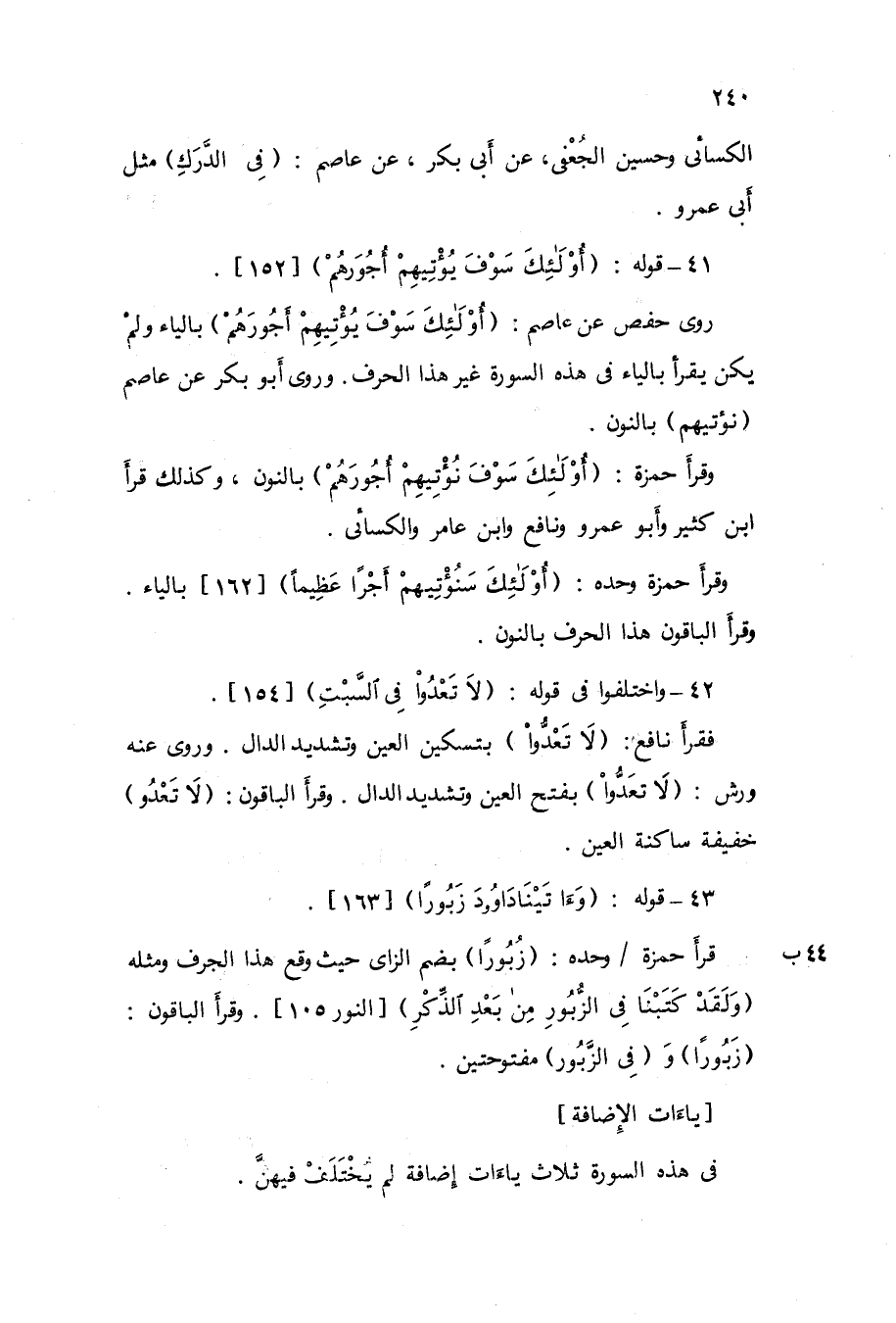 وَقَرَأَ حَمْزَة / أُولَئِكَ سَوف نؤتيهم أُجُورهم / بالنُّون وَكَذَلِكَ قَرَأَ ابْن كثير وَأَبُو عَمْرو وَنَافِع وَابْن عَامر والكسائى