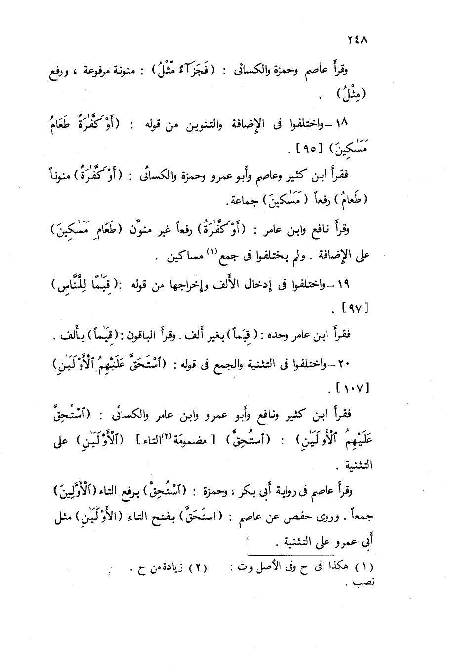 18 - وَاخْتلفُوا فى الْإِضَافَة والتنوين من قَوْله {أَو كَفَّارَة طَعَام مَسَاكِين} 95