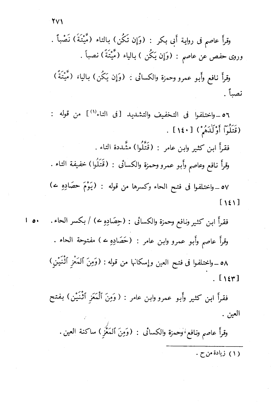56 - وَاخْتلفُوا فى التَّخْفِيف وَالتَّشْدِيد فى التَّاء من قَوْله {قتلوا أَوْلَادهم} 140