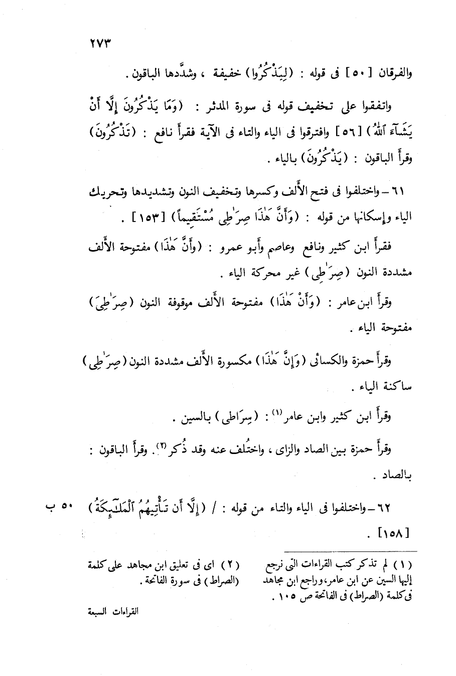 61 - وَاخْتلفُوا فى فتح الْألف وَكسرهَا وَتَخْفِيف النُّون وتشديدها وتحريك الْيَاء وإسكانها من قَوْله {وَأَن هَذَا صِرَاطِي مُسْتَقِيمًا} 153