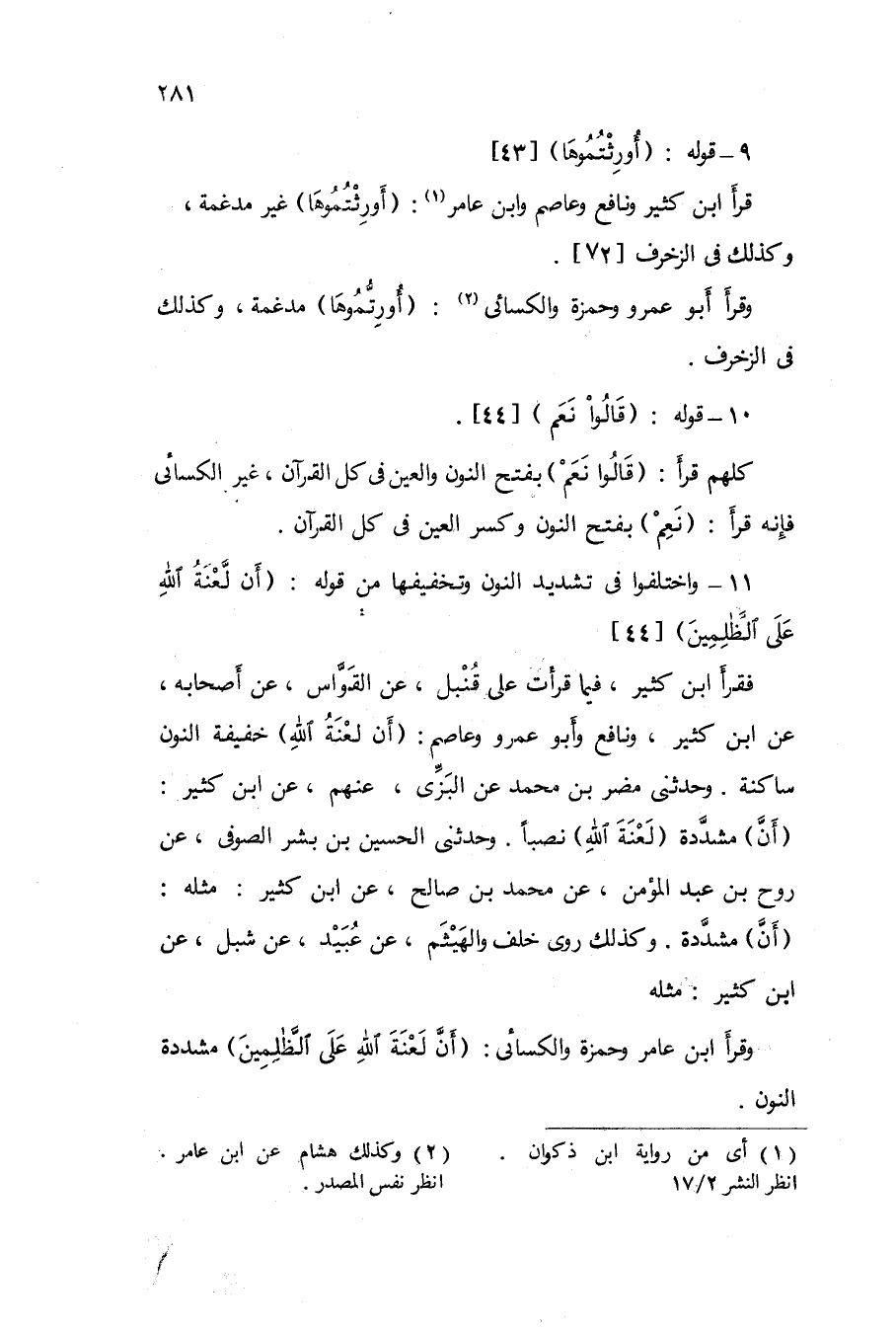 وَقَرَأَ أَبُو عَمْرو وَحَمْزَة والكسائى / أورتموها / مدغمة وَكَذَلِكَ فى الزخرف