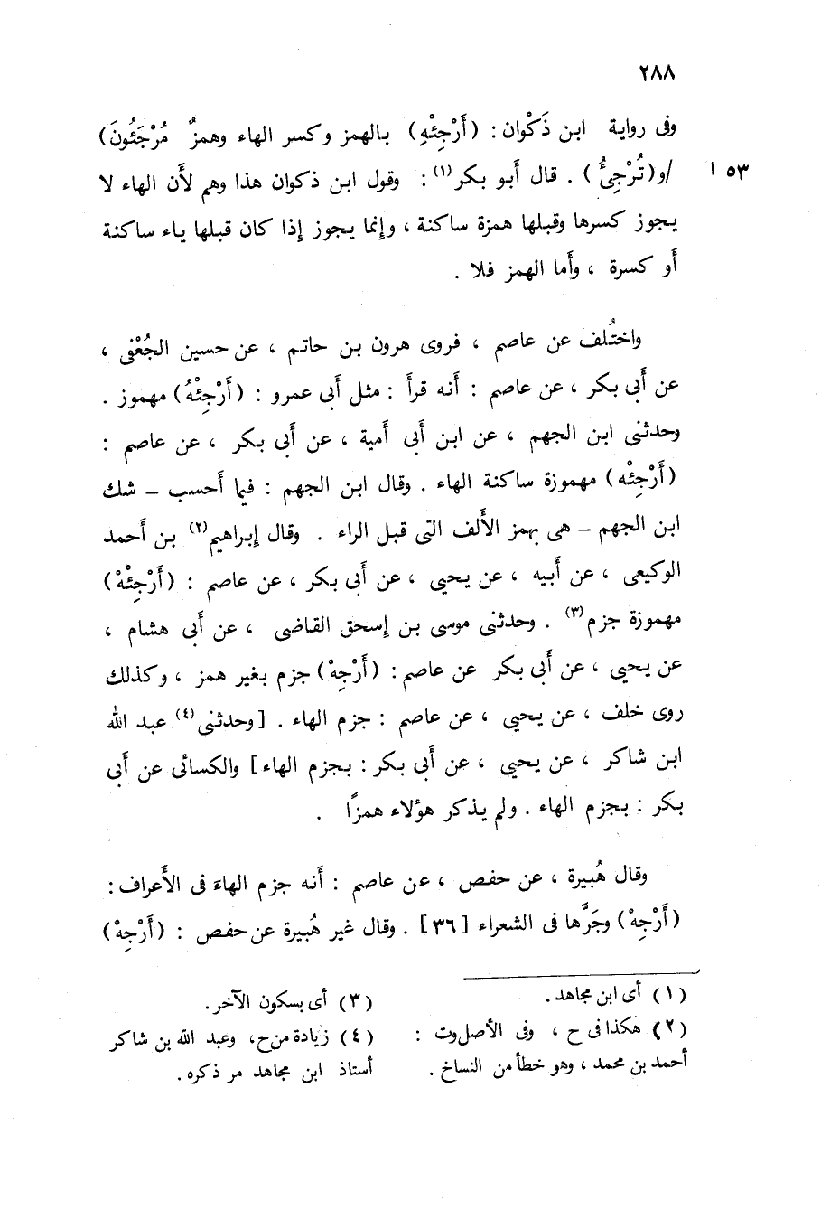 وحدثنى مُوسَى بن إِسْحَق القاضى عَن أبي هِشَام عَن يحيى عَن أَبى بكر عَن عَاصِم {أرجه} جزم بِغَيْر همز وَكَذَلِكَ روى خلف عَن يحيى عَن عَاصِم جزم الْهَاء