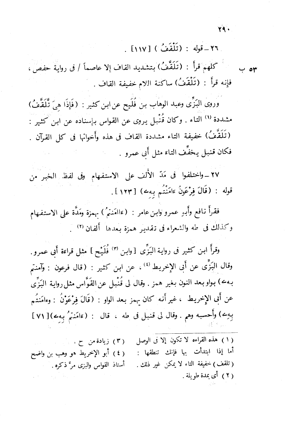 وَكَانَ قنبل يرْوى عَن القواس بِإِسْنَادِهِ عَن ابْن كثير {تلقف} خَفِيفَة التَّاء مُشَدّدَة الْقَاف فى هَذِه وَأَخَوَاتهَا فى كل الْقُرْآن